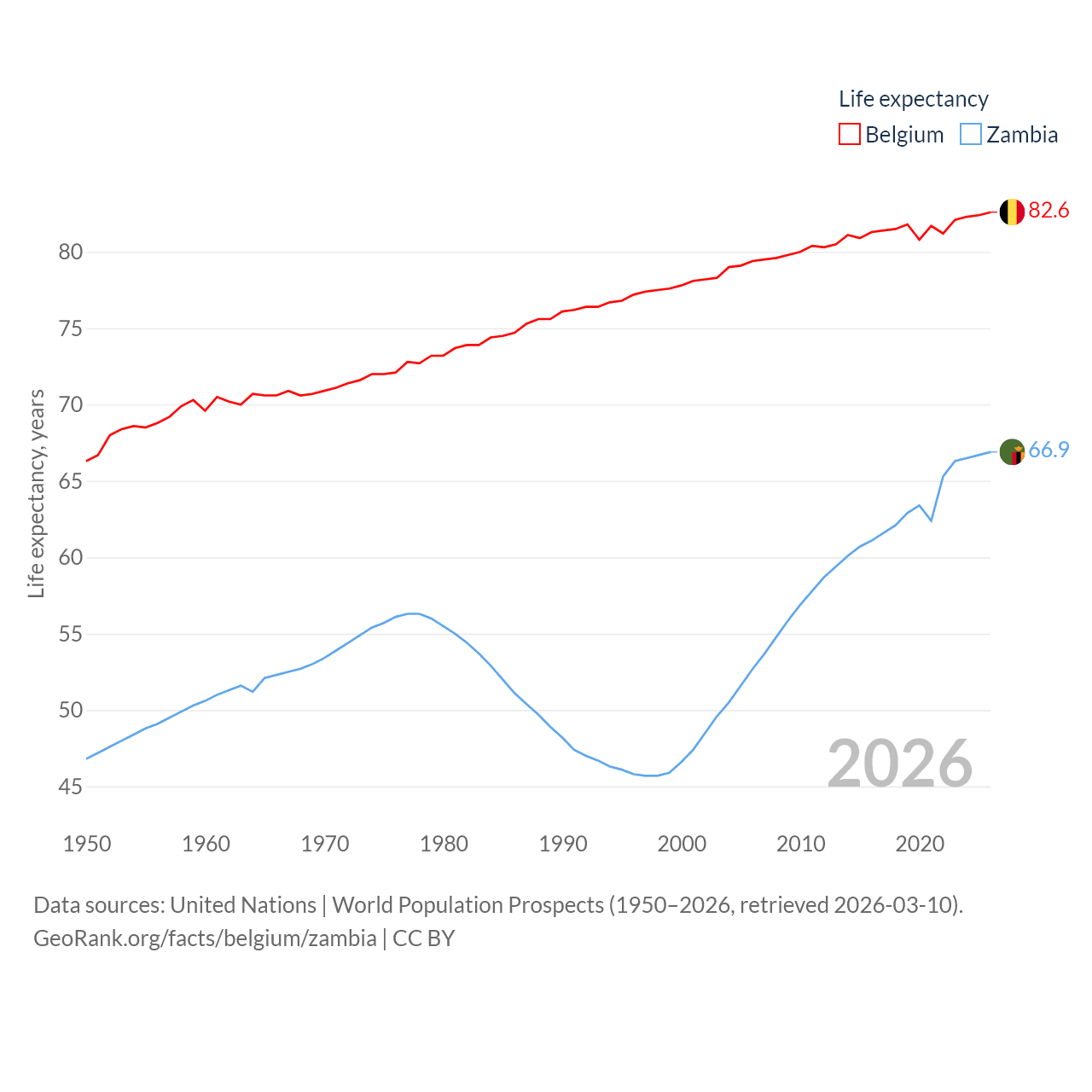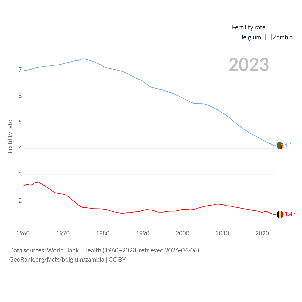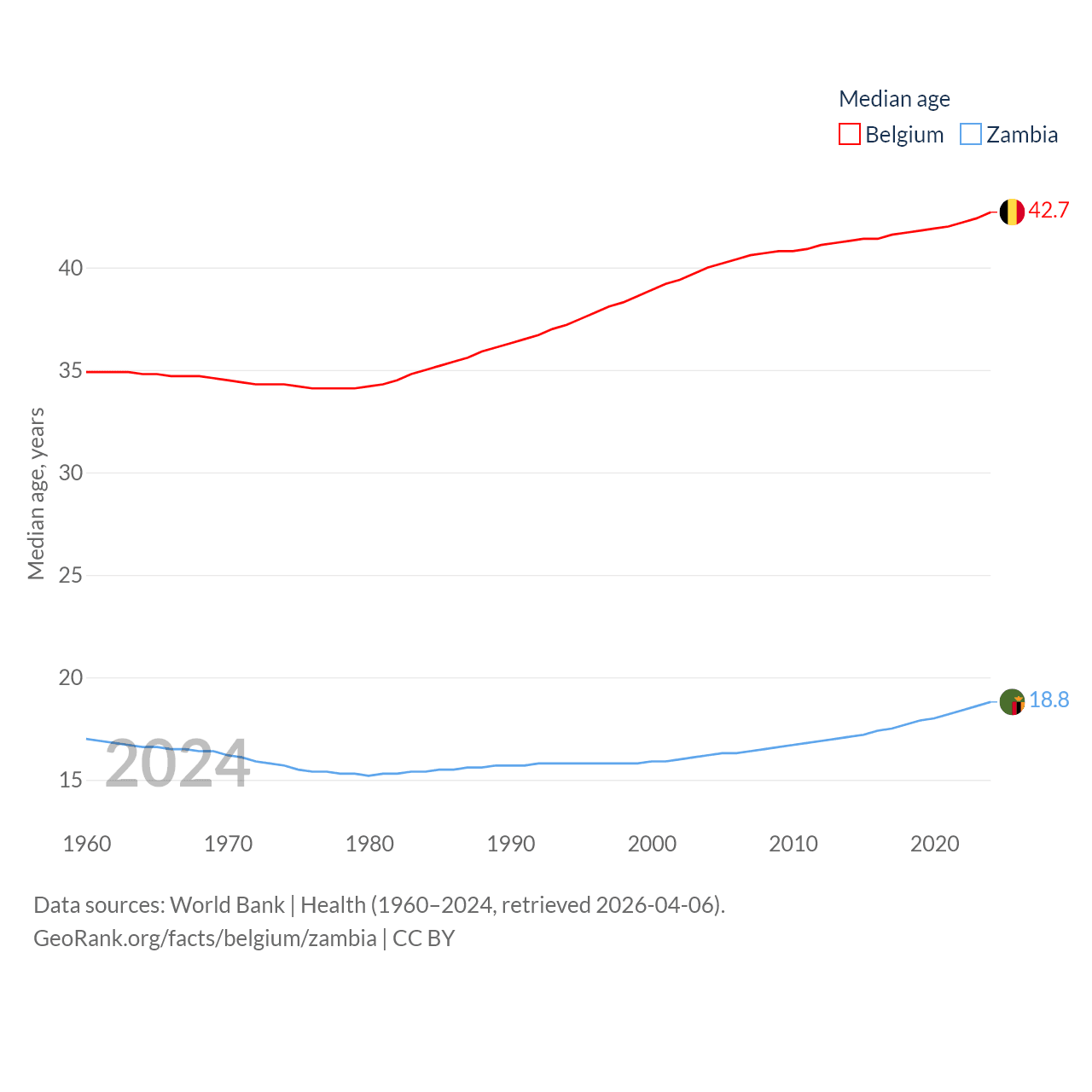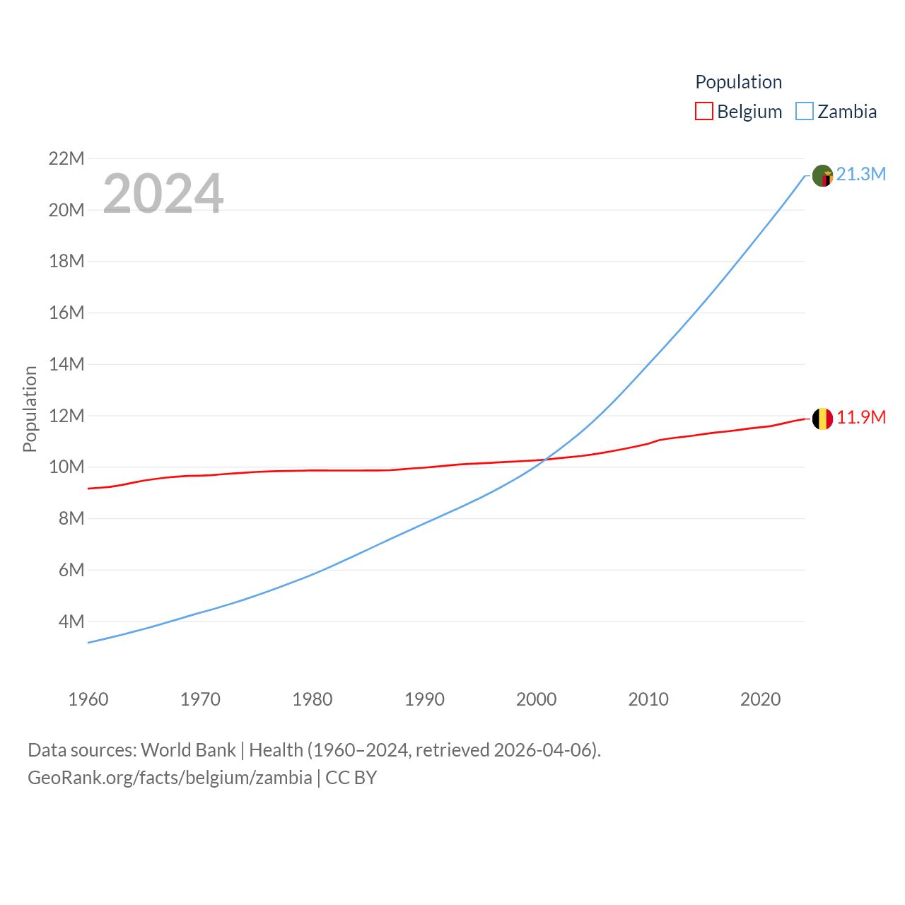 Belgium has a population of 11.9M (ranked 82/197), compared with 21.3M in Zambia (ranked 63/197). Belgium's land area is 11,774 sq mi versus 287,024 sq mi for Zambia (ranked 136th vs. 37th).