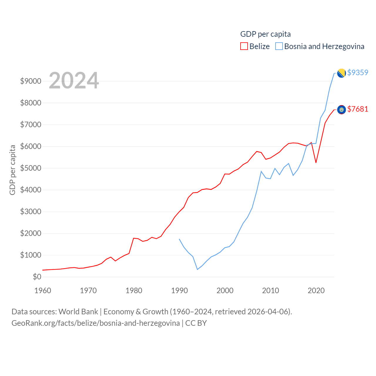 By GDP, Belize ranks 168/197 ($3.2B) and Bosnia and Herzegovina ranks 111/197 ($29.6B). By GDP per capita, Belize ranks 98/197 ($7,681), while Bosnia and Herzegovina ranks 87/197 ($9,359).