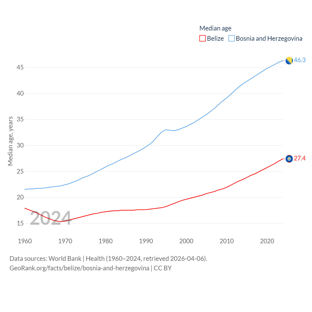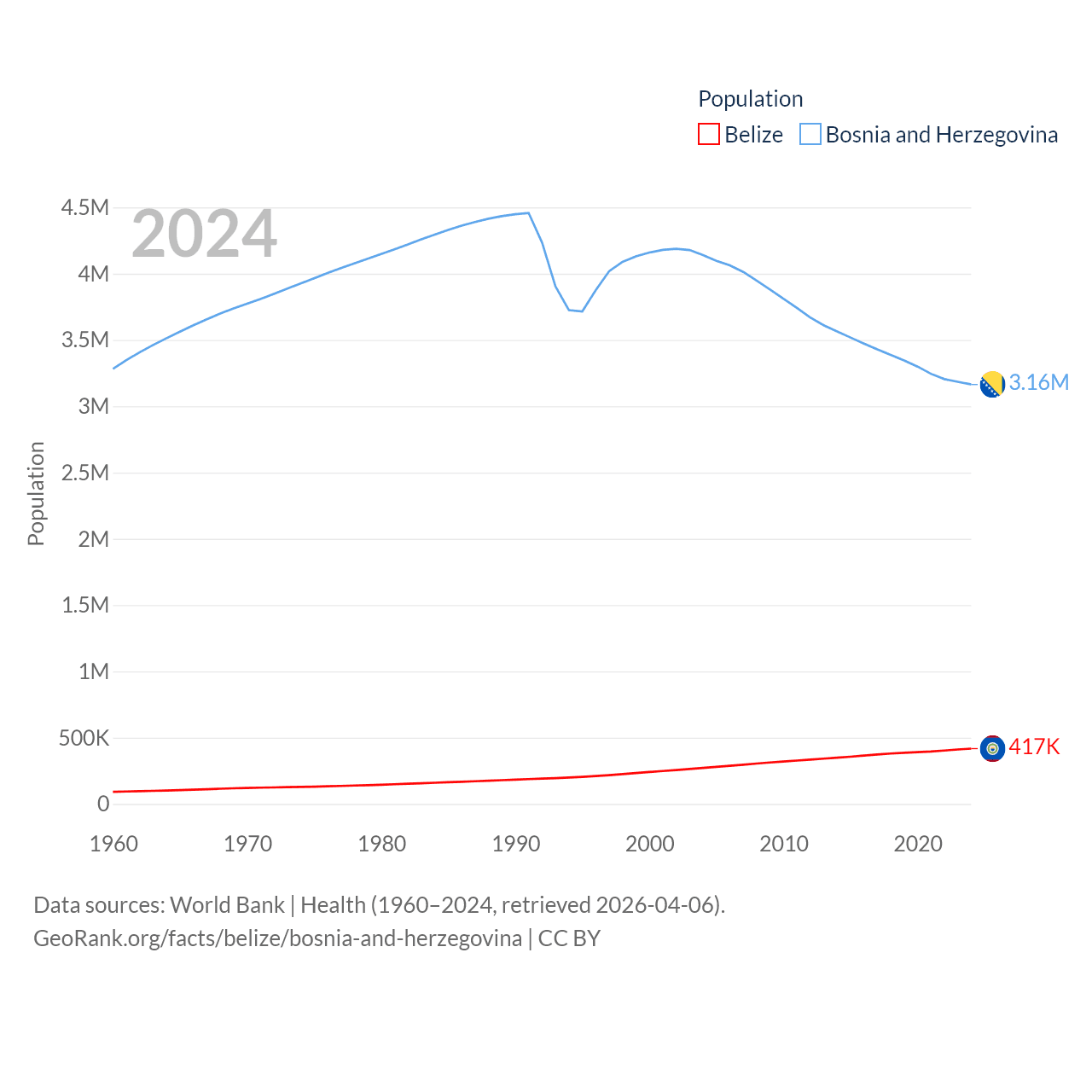 Belize has a population of 417K (ranked 171/197), compared with 3.16M in Bosnia and Herzegovina (ranked 134/197). Belize's land area is 8,807 sq mi versus 19,768 sq mi for Bosnia and Herzegovina (ranked 148th vs. 125th).