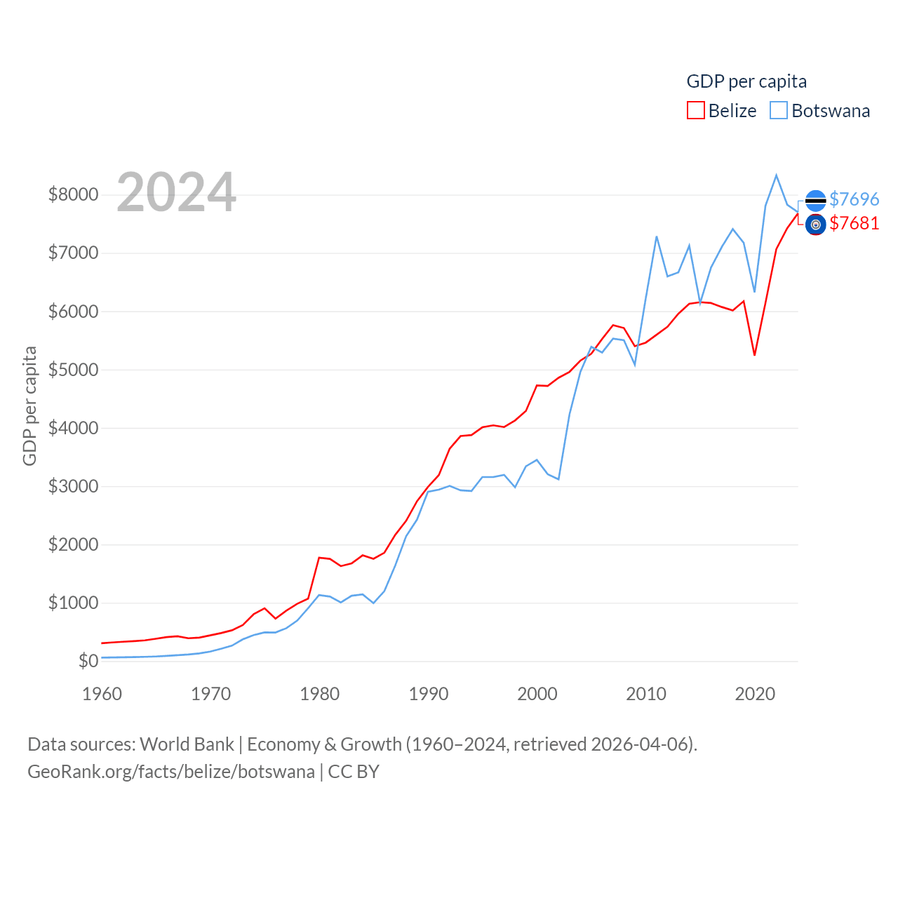 By GDP, Belize ranks 168/197 ($3.2B) and Botswana ranks 133/197 ($19.4B). By GDP per capita, Belize ranks 98/197 ($7,681), while Botswana ranks 97/197 ($7,696).