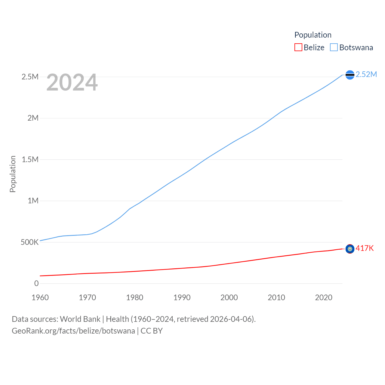 Belize has a population of 417K (ranked 171/197), compared with 2.52M in Botswana (ranked 142/197). Belize's land area is 8,807 sq mi versus 218,816 sq mi for Botswana (ranked 148th vs. 47th).