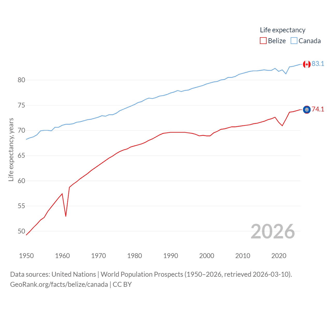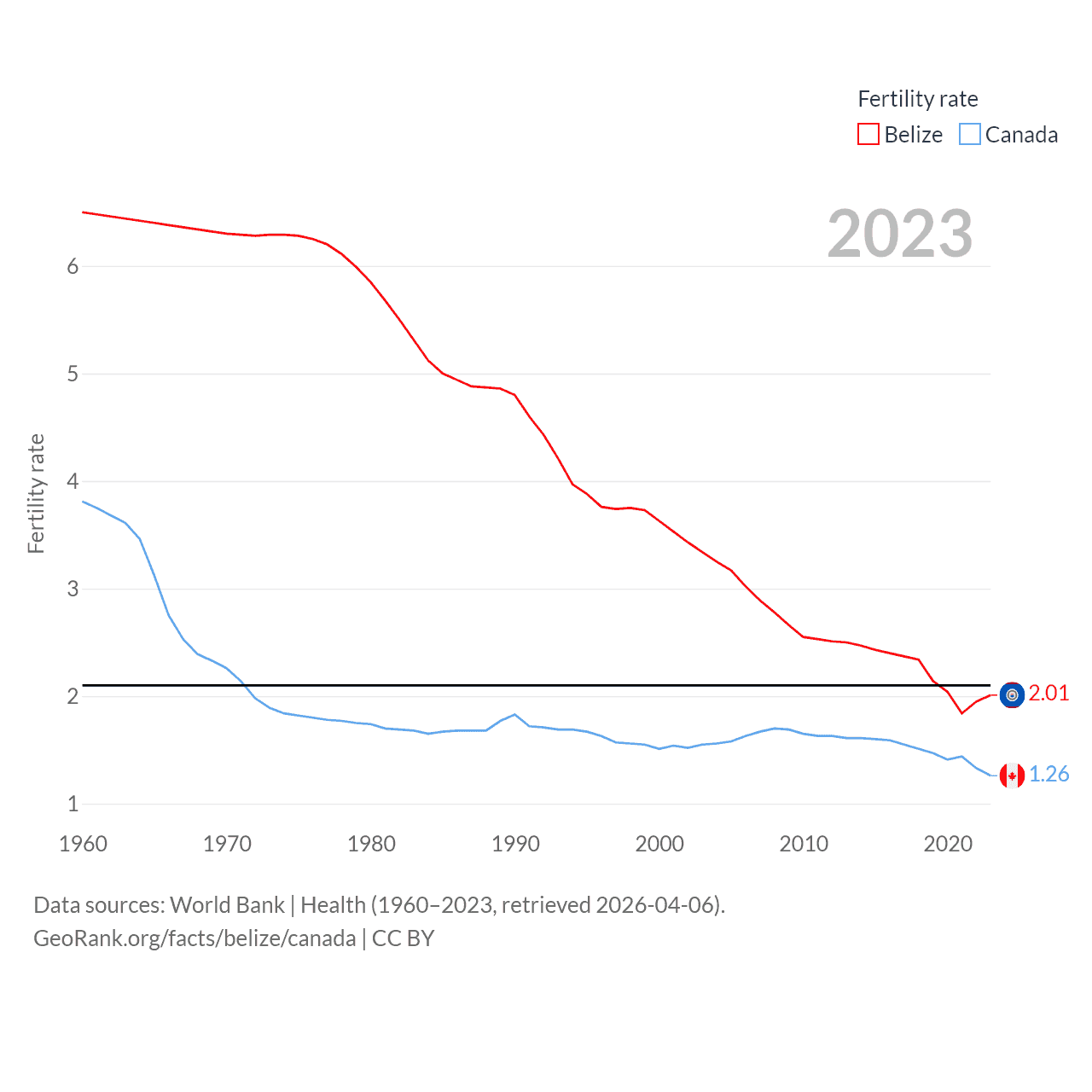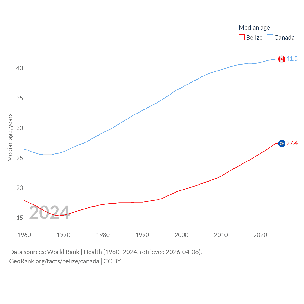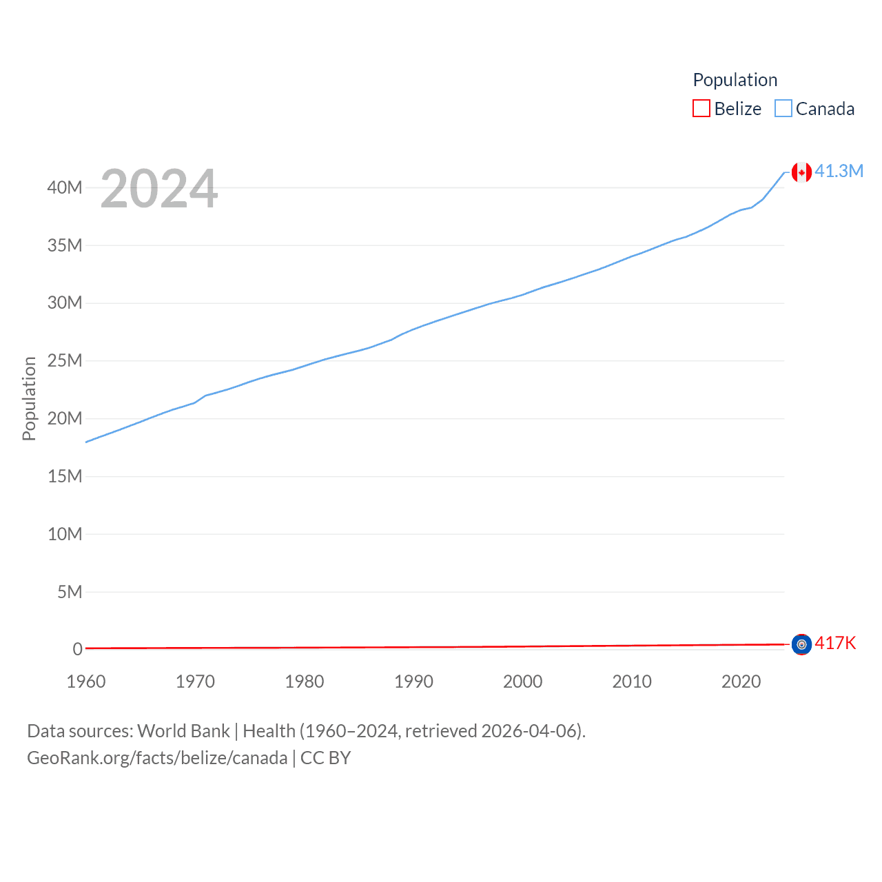 Belize has a population of 417K (ranked 171/197), compared with 41.3M in Canada (ranked 37/197). Belize's land area is 8,807 sq mi versus 3,393,336 sq mi for Canada (ranked 148th vs. 4th).