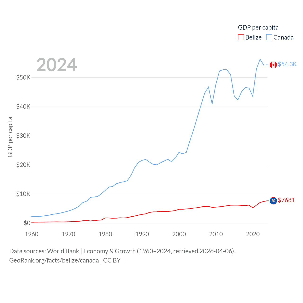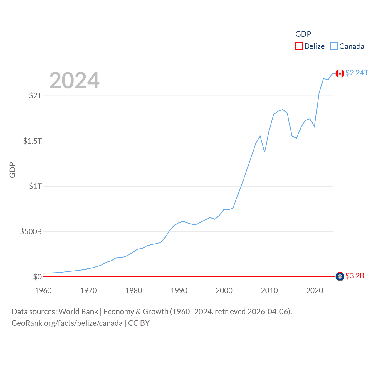 By GDP, Belize ranks 168/197 ($3.2B) and Canada ranks 9/197 ($2.24T). By GDP per capita, Belize ranks 98/197 ($7,681), while Canada ranks 20/197 ($54,340).