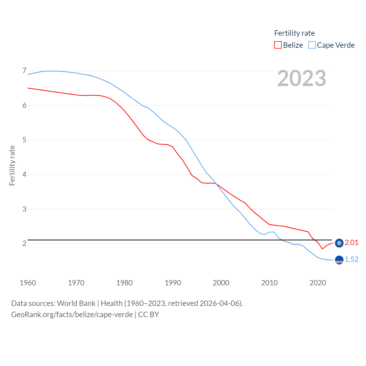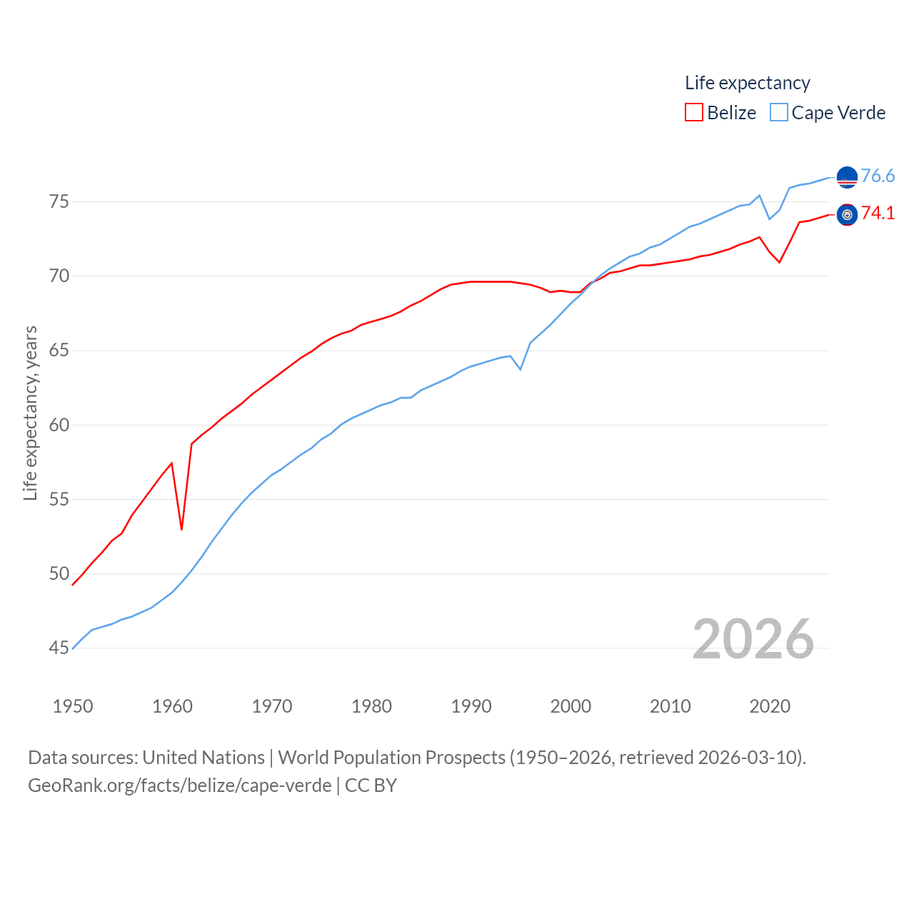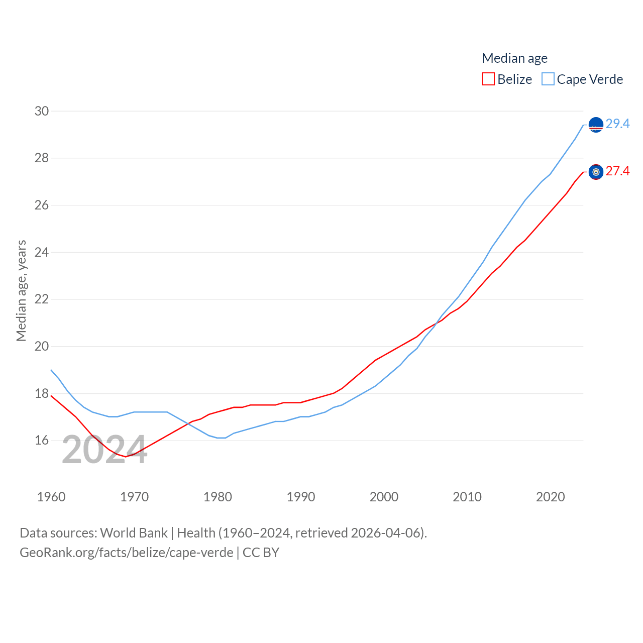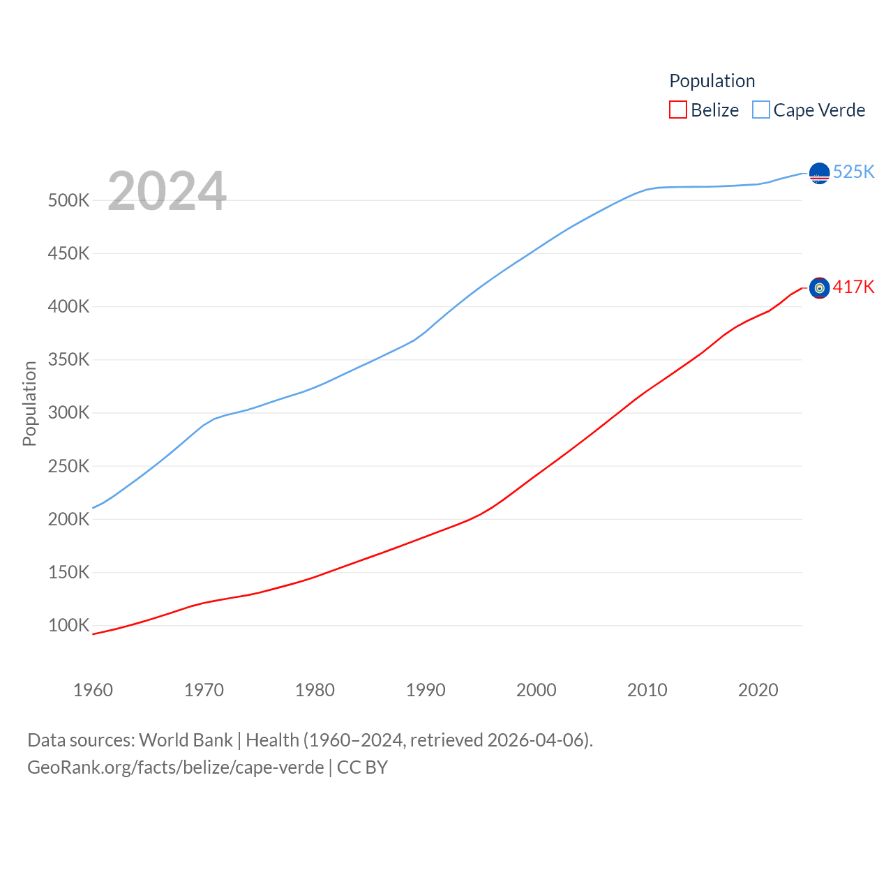 Belize has a population of 417K (ranked 171/197), compared with 525K in Cape Verde (ranked 169/197). Belize's land area is 8,807 sq mi versus 1,556 sq mi for Cape Verde (ranked 148th vs. 167th).
