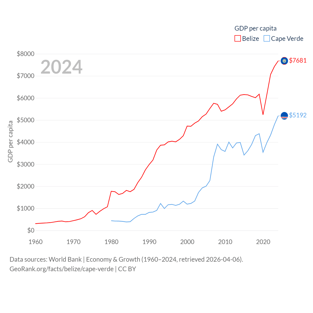 By GDP, Belize ranks 168/197 ($3.2B) and Cape Verde ranks 172/197 ($2.73B). By GDP per capita, Belize ranks 98/197 ($7,681), while Cape Verde ranks 118/197 ($5,192).