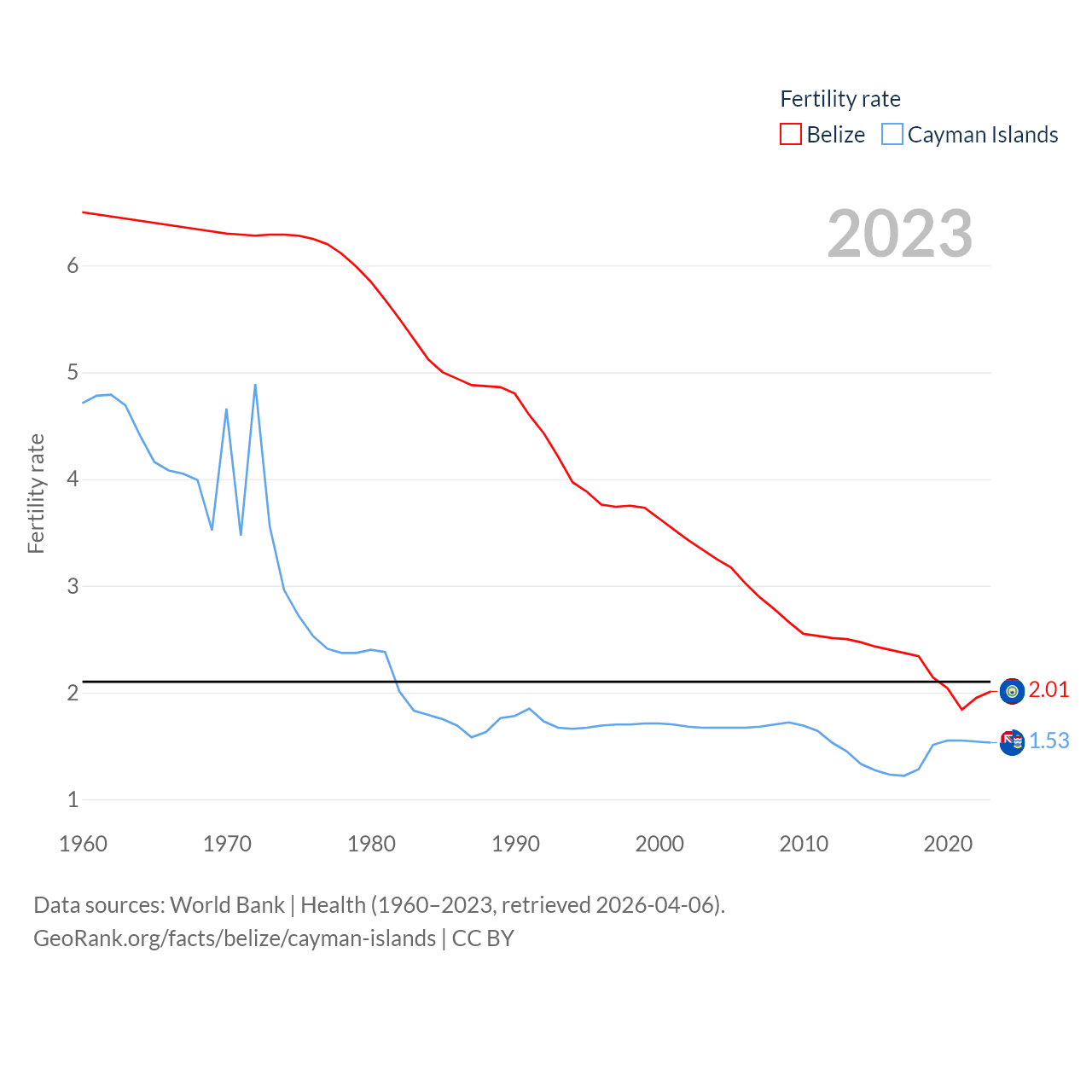 Belize has a population of 417K (ranked 171/197), compared with 74.5K in The Cayman Islands (ranked 187/197). Belize's land area is 8,807 sq mi versus 92.7 sq mi for The Cayman Islands (ranked 148th vs. 190th).