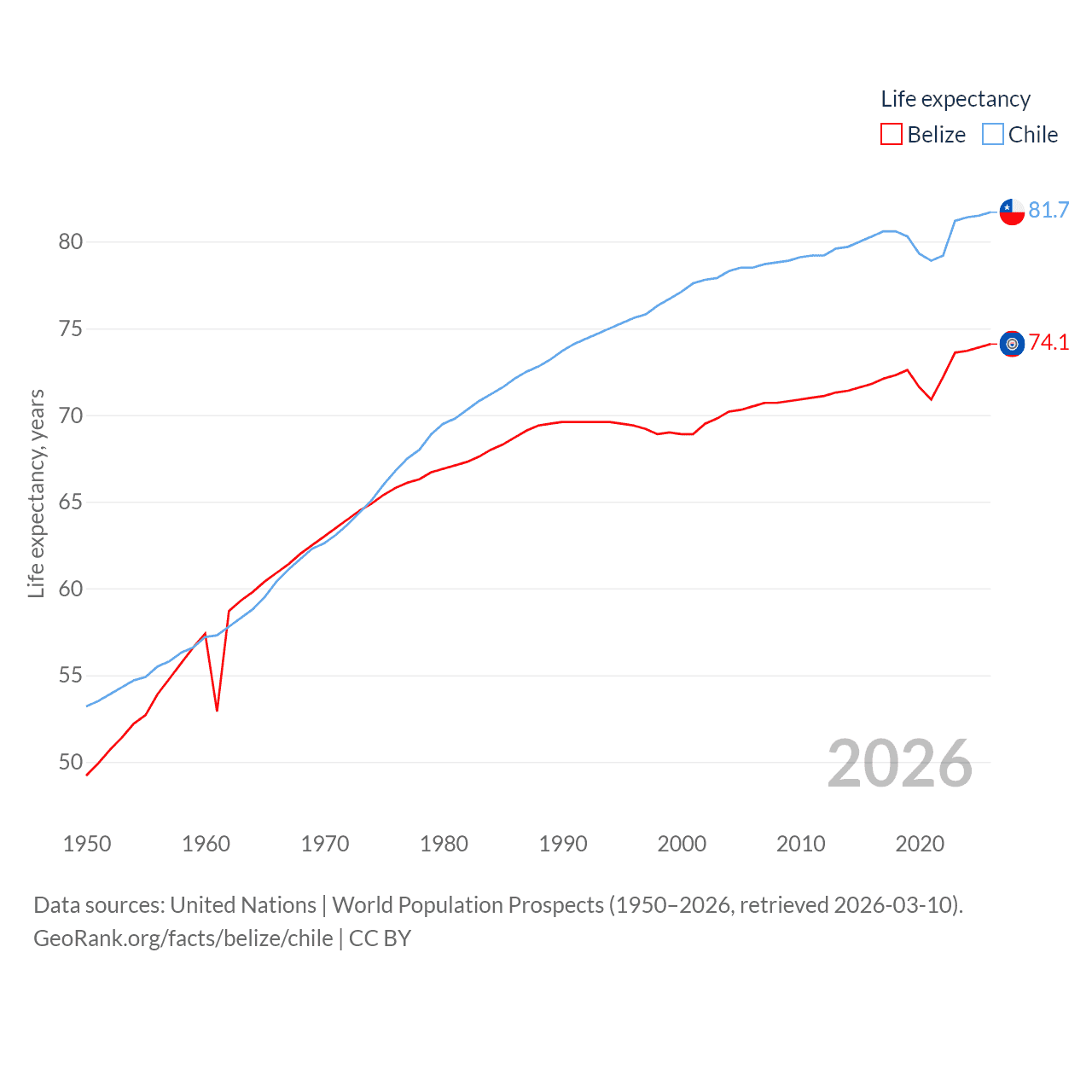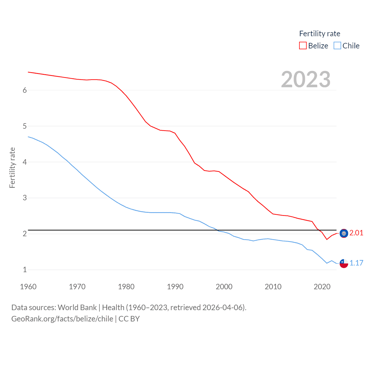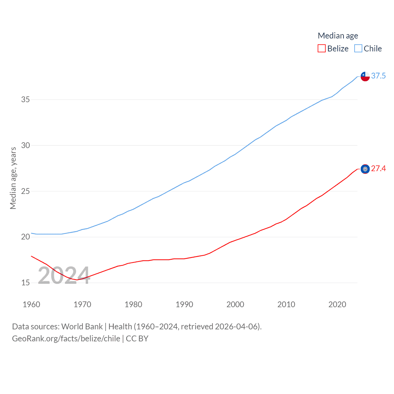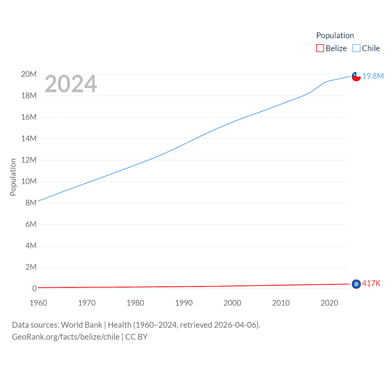 Belize has a population of 417K (ranked 171/197), compared with 19.8M in Chile (ranked 66/197). Belize's land area is 8,807 sq mi versus 286,809 sq mi for Chile (ranked 148th vs. 38th).
