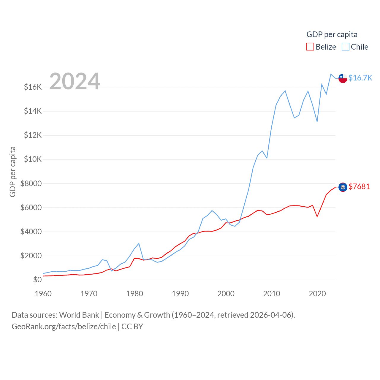 By GDP, Belize ranks 168/197 ($3.2B) and Chile ranks 45/197 ($330B). By GDP per capita, Belize ranks 98/197 ($7,681), while Chile ranks 65/197 ($16,710).
