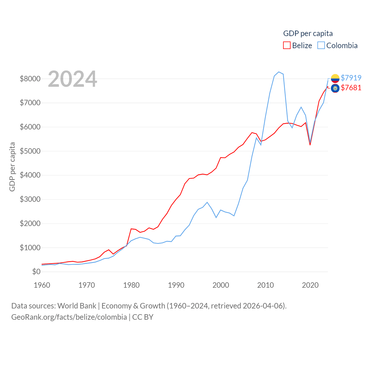 By GDP, Belize ranks 168/197 ($3.2B) and Colombia ranks 39/197 ($419B). By GDP per capita, Belize ranks 98/197 ($7,681), while Colombia ranks 94/197 ($7,919).