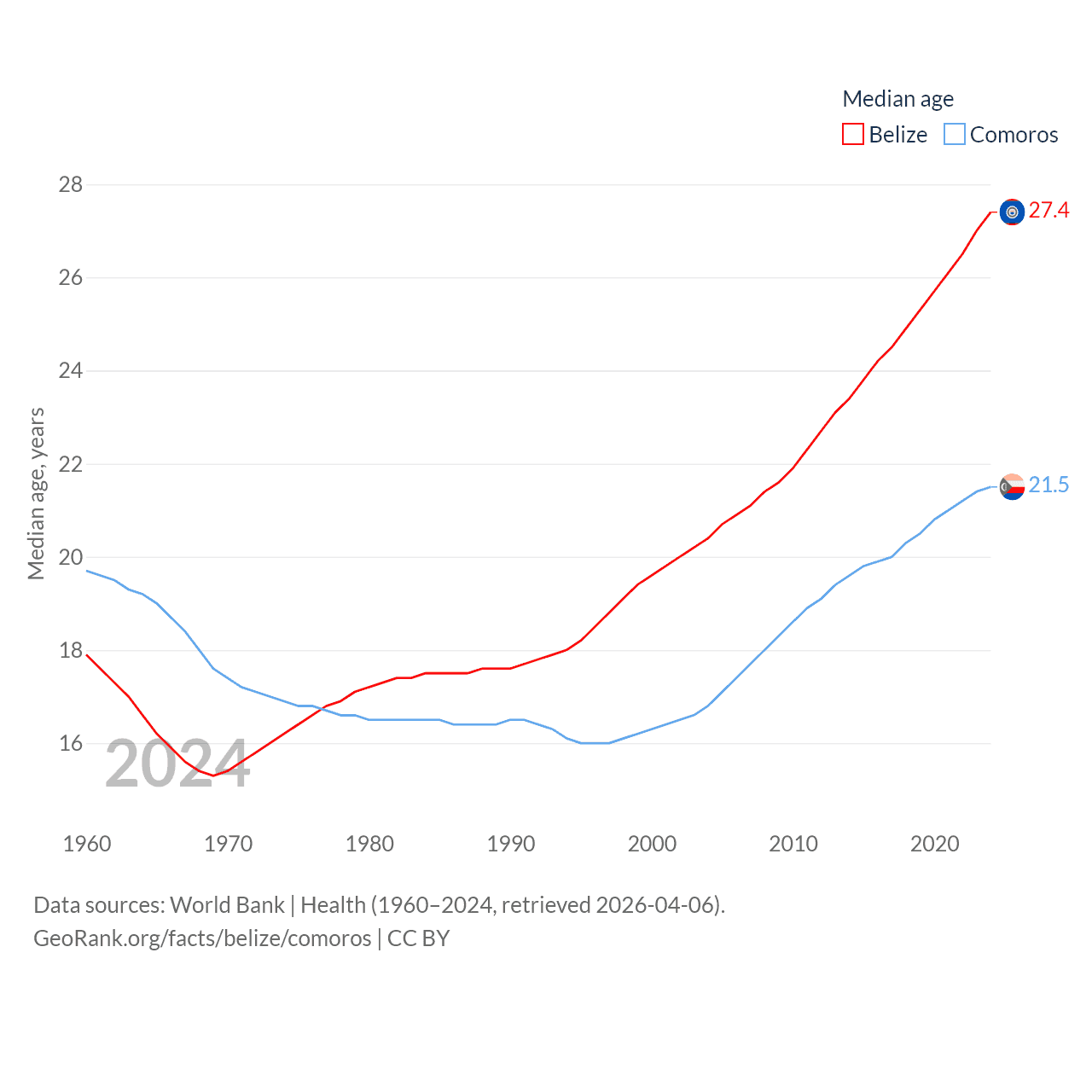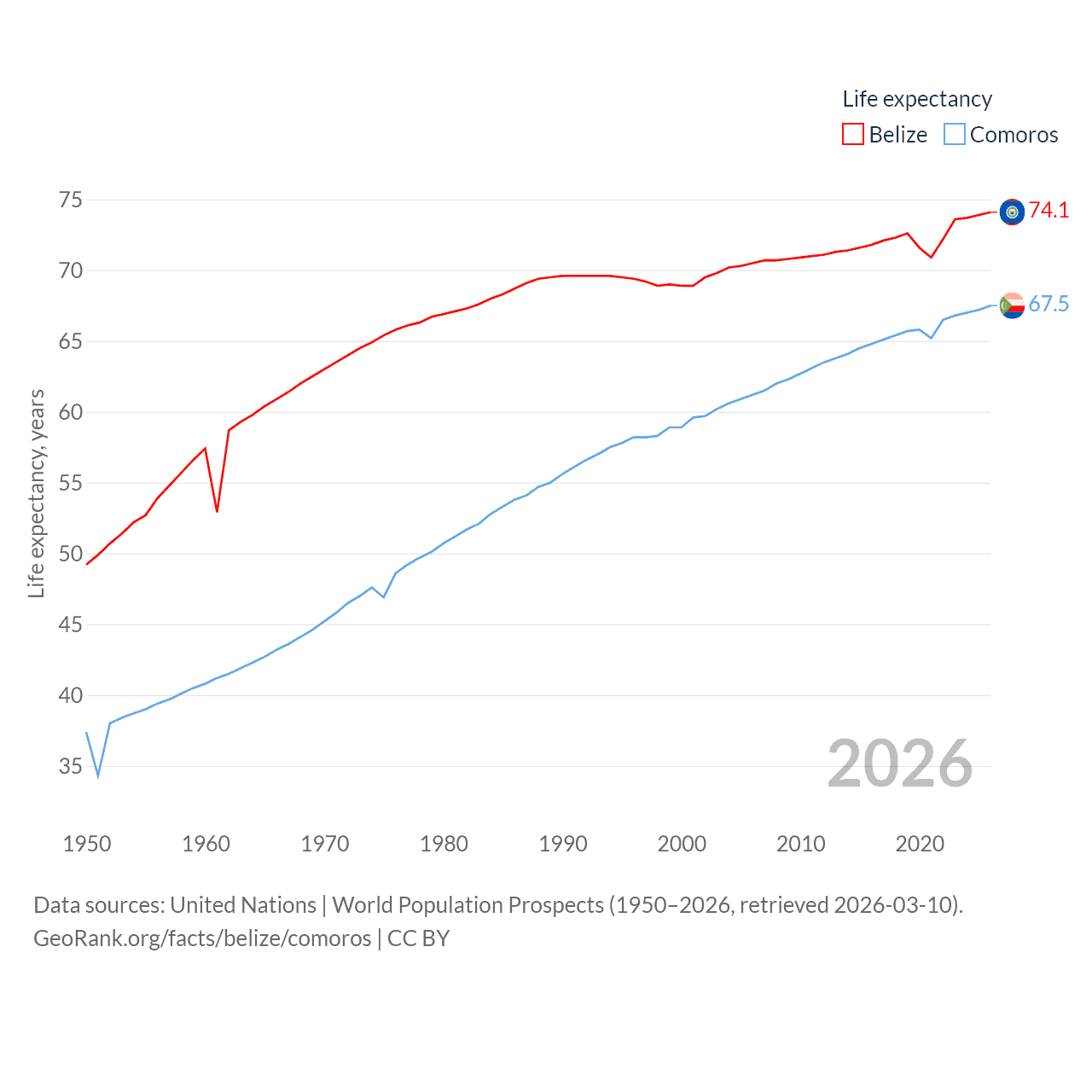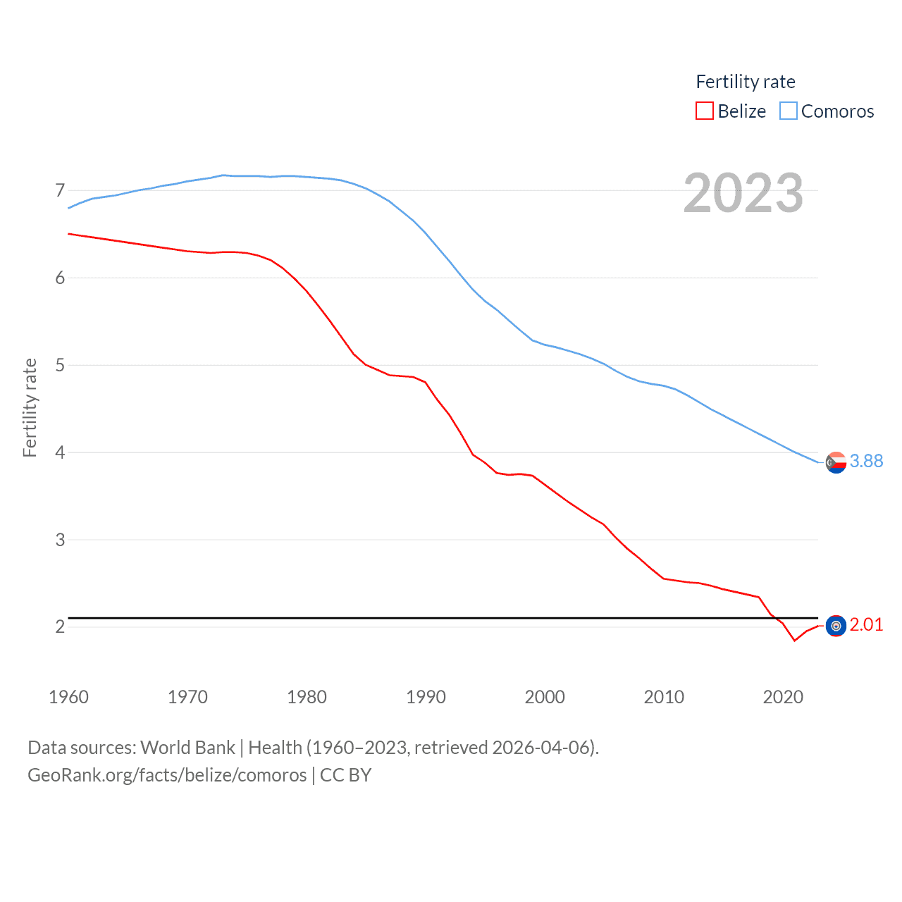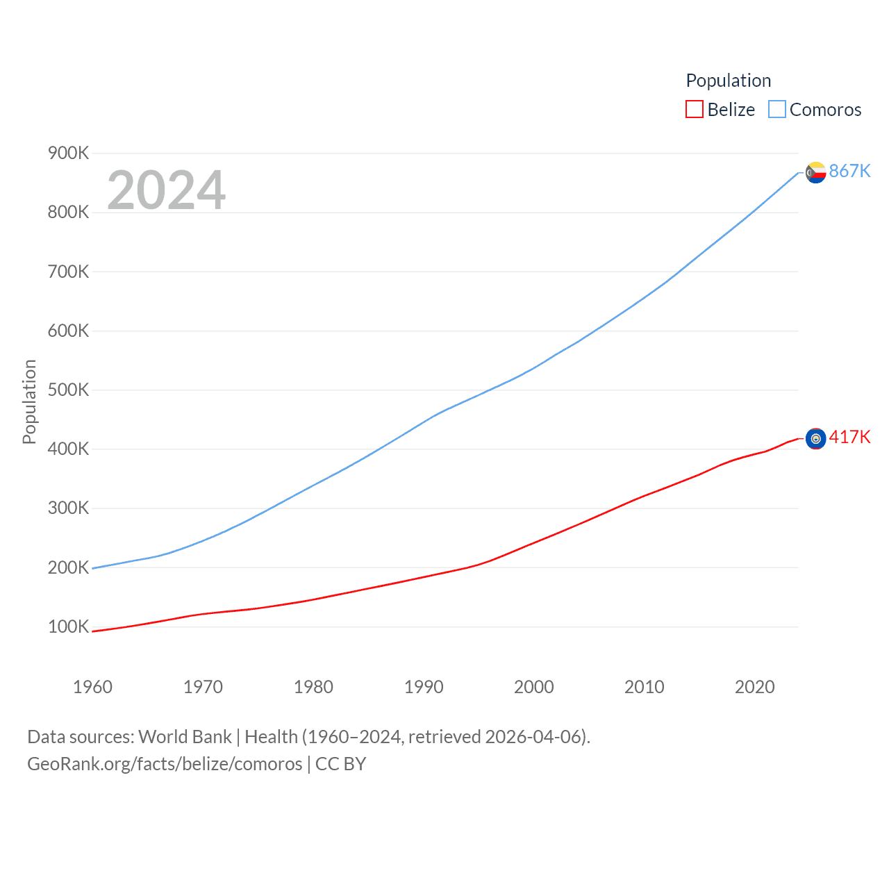 Belize has a population of 417K (ranked 171/197), compared with 867K in Comoros (ranked 160/197). Belize's land area is 8,807 sq mi versus 719 sq mi for Comoros (ranked 148th vs. 171st).