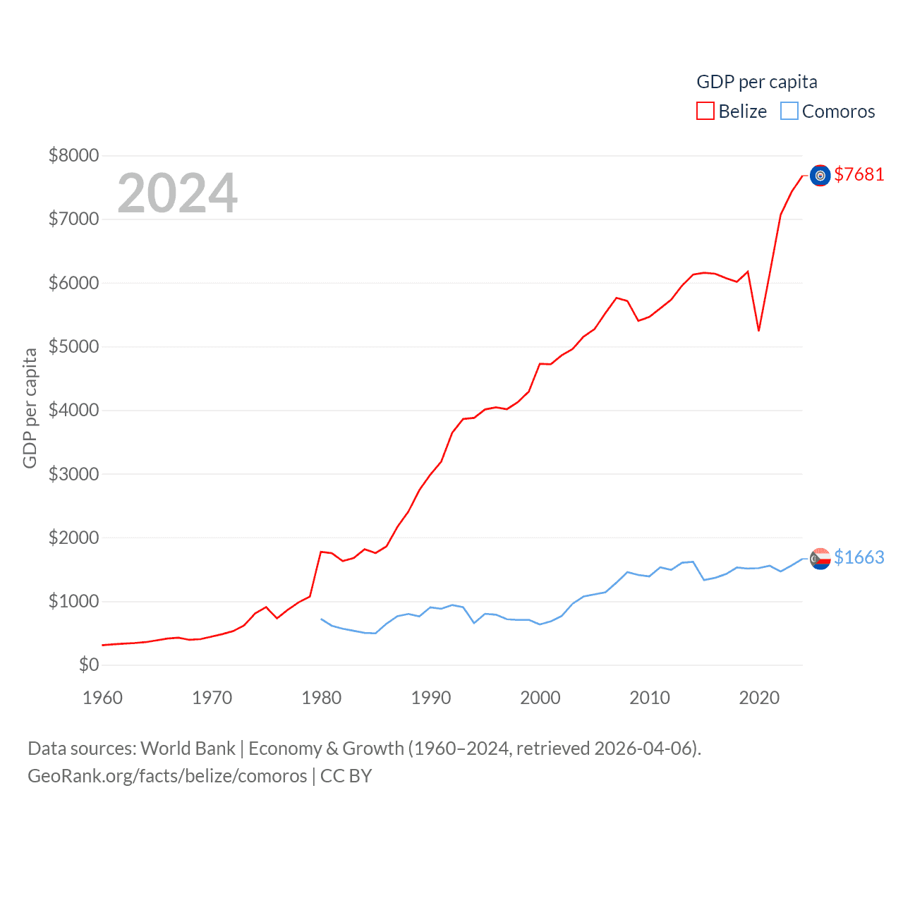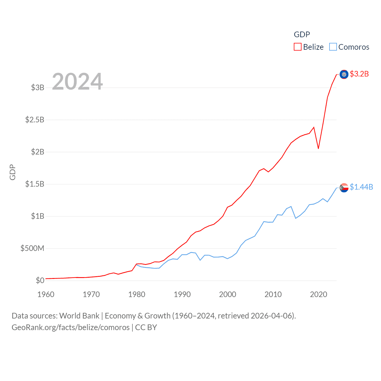 By GDP, Belize ranks 168/197 ($3.2B) and Comoros ranks 183/197 ($1.44B). By GDP per capita, Belize ranks 98/197 ($7,681), while Comoros ranks 161/197 ($1,663).