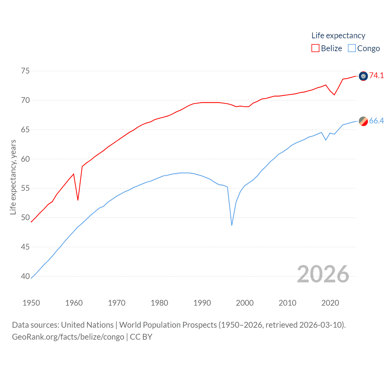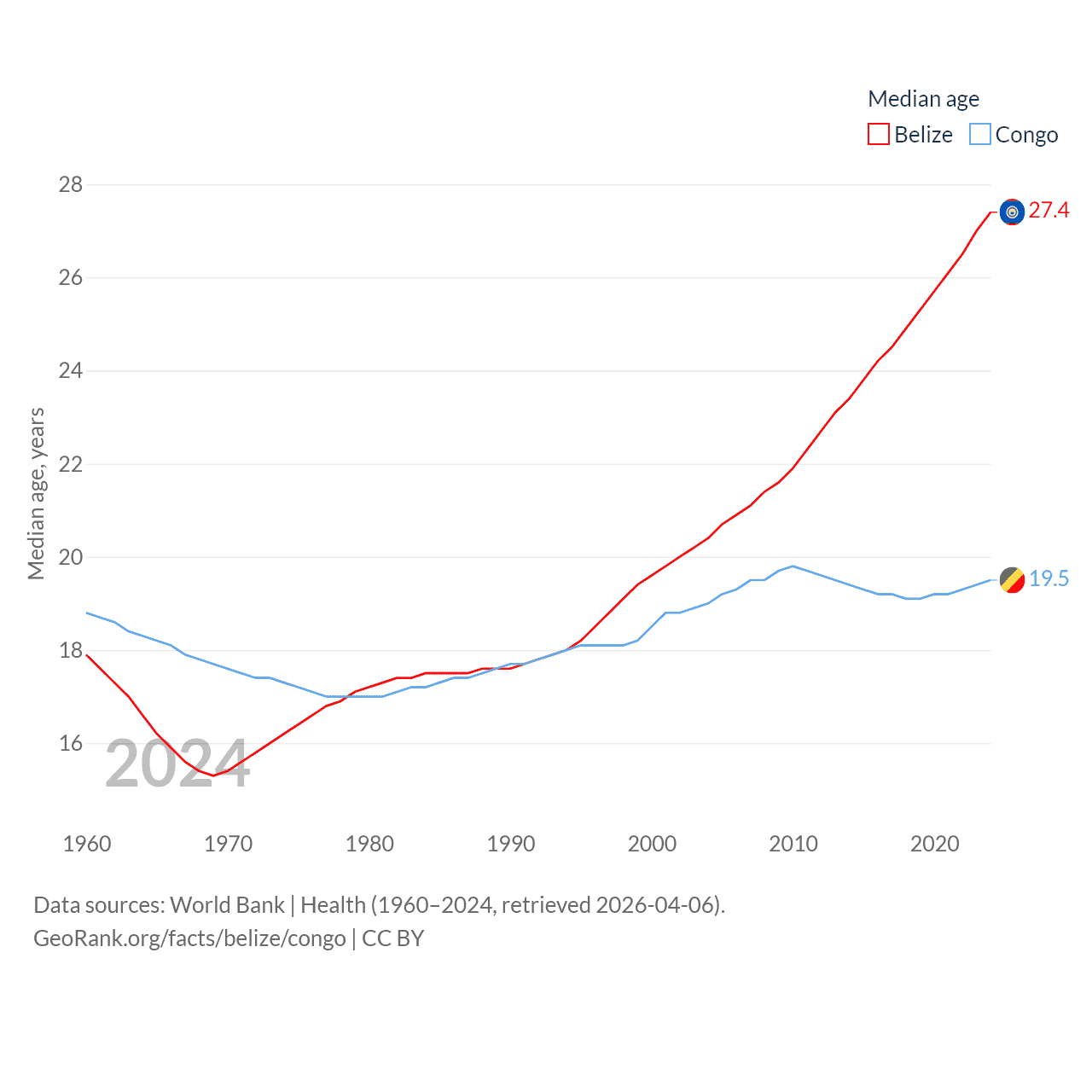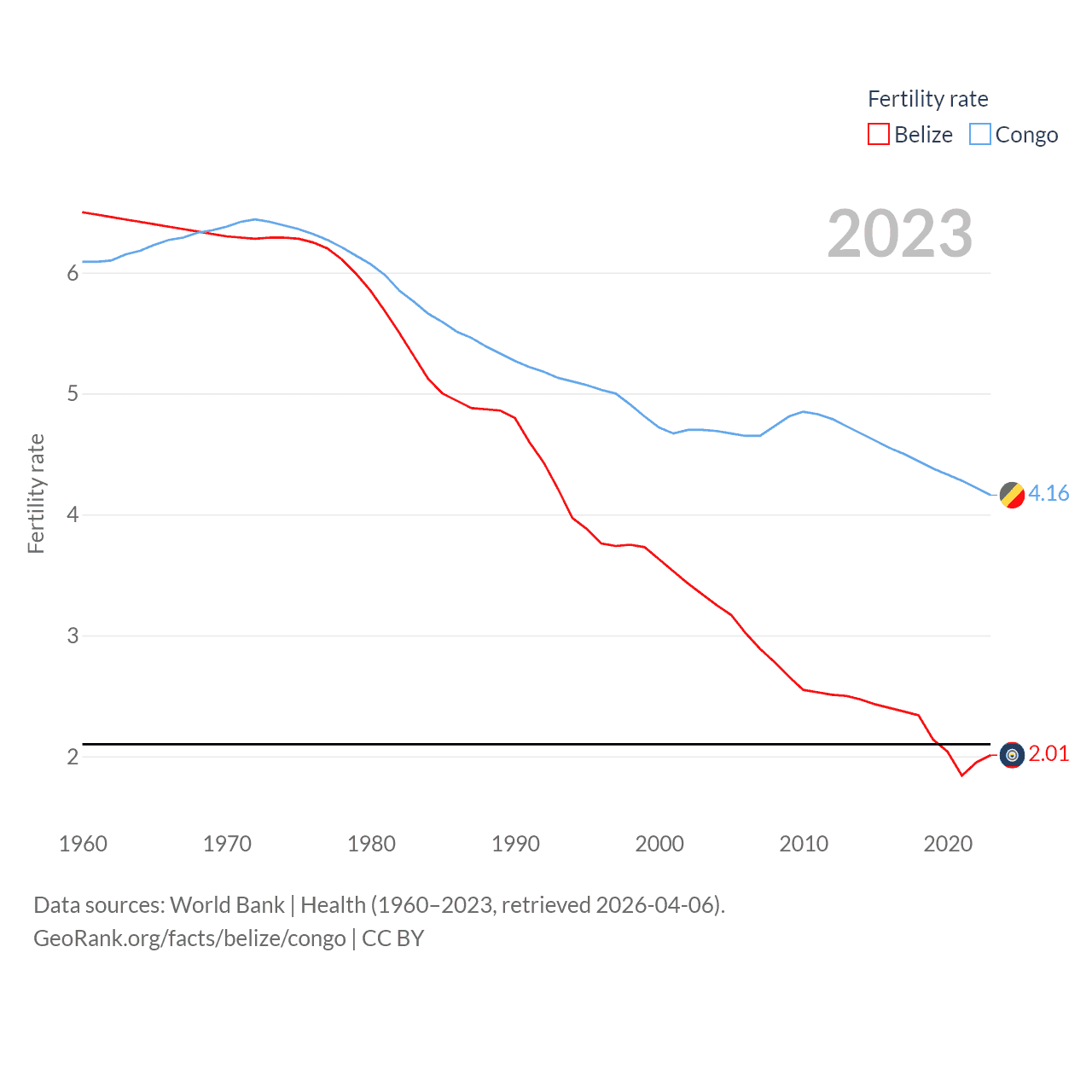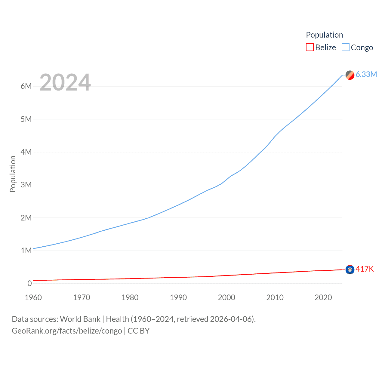 Belize has a population of 417K (ranked 171/197), compared with 6.33M in The Congo (ranked 112/197). Belize's land area is 8,807 sq mi versus 131,854 sq mi for The Congo (ranked 148th vs. 64th).