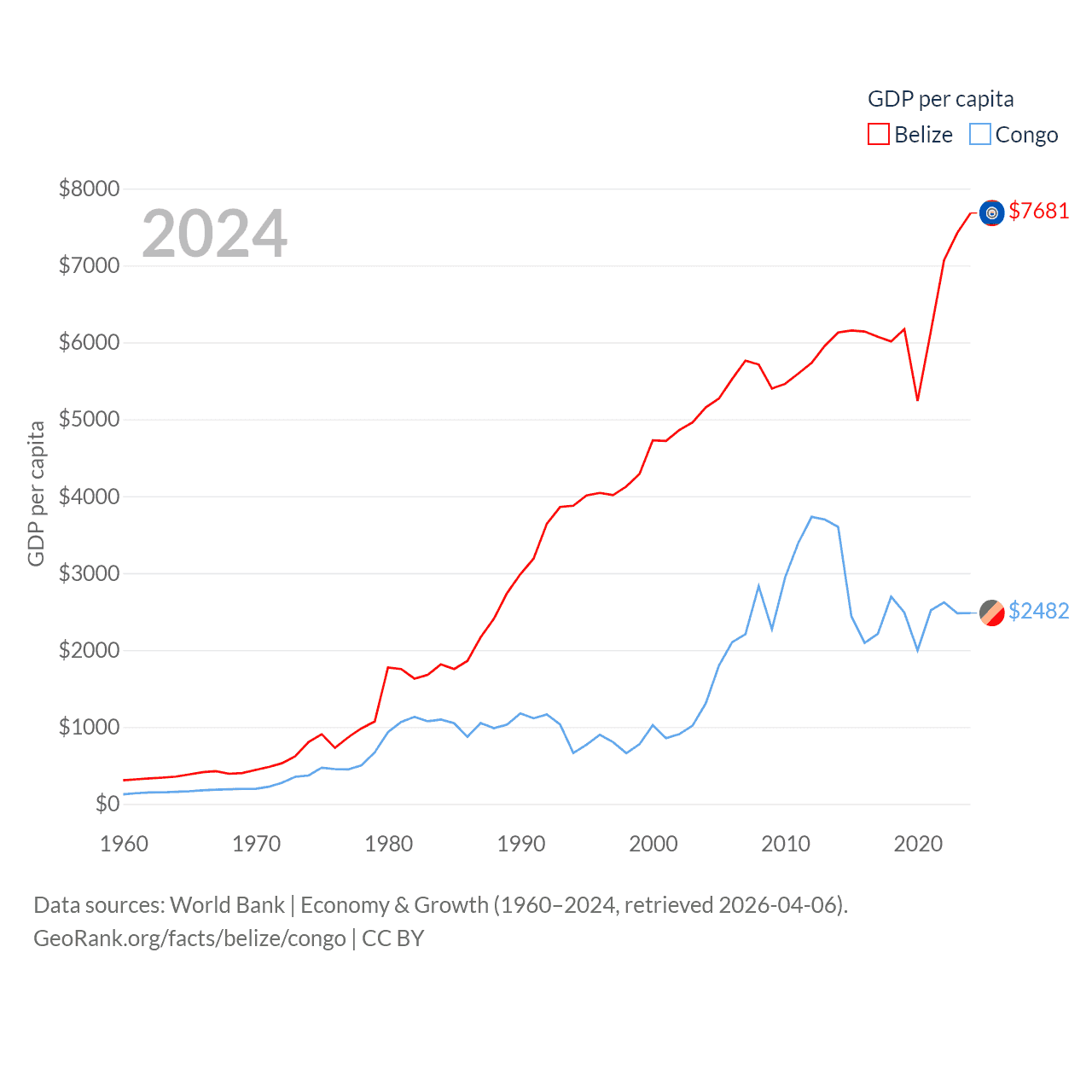 By GDP, Belize ranks 168/197 ($3.2B) and The Congo ranks 141/197 ($15.7B). By GDP per capita, Belize ranks 98/197 ($7,681), while The Congo ranks 149/197 ($2,482).