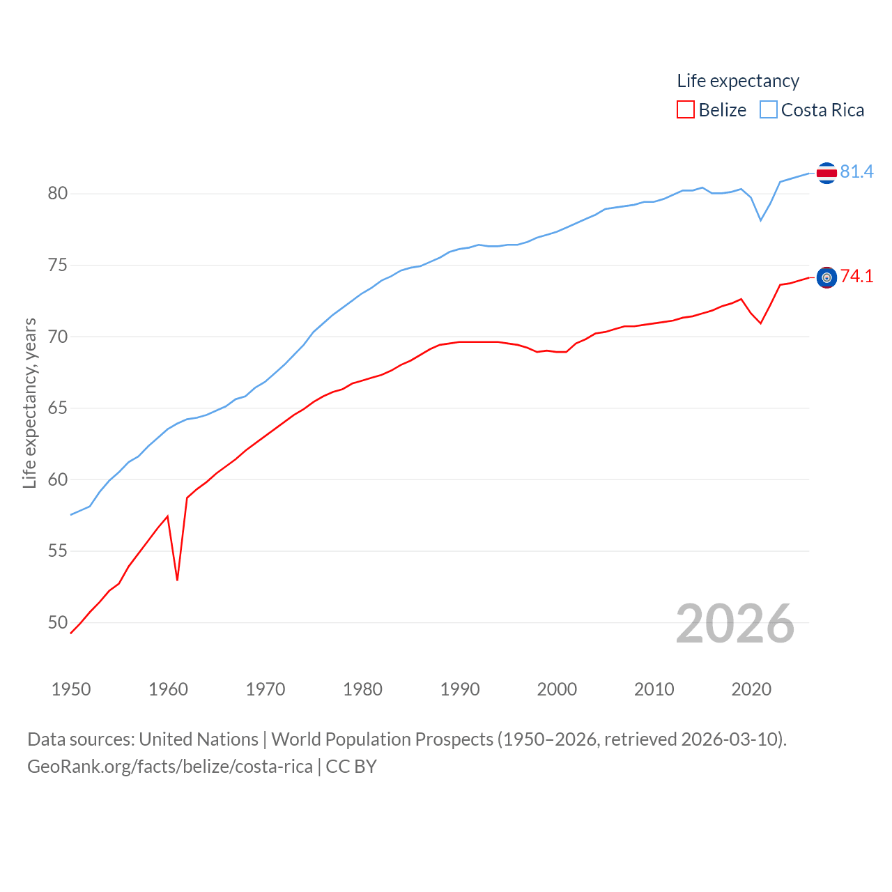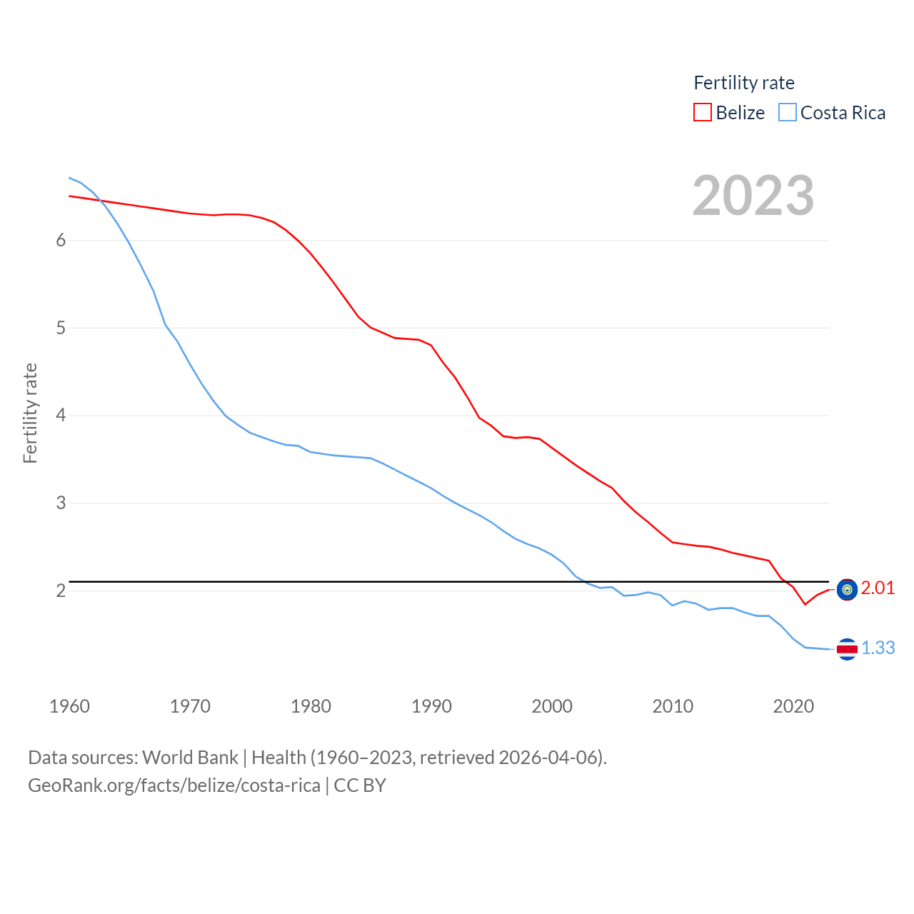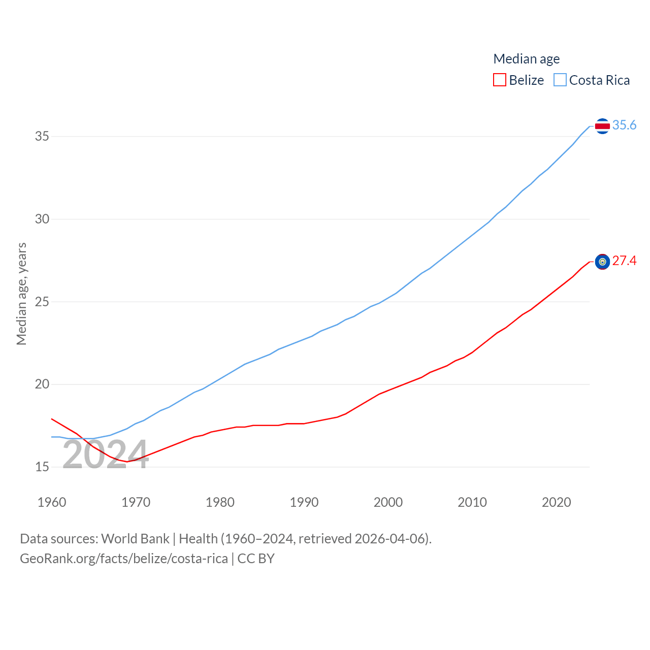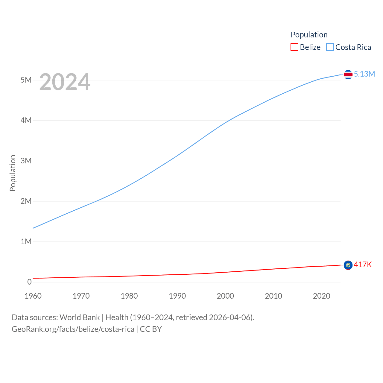 Belize has a population of 417K (ranked 171/197), compared with 5.13M in Costa Rica (ranked 126/197). Belize's land area is 8,807 sq mi versus 19,714 sq mi for Costa Rica (ranked 148th vs. 126th).