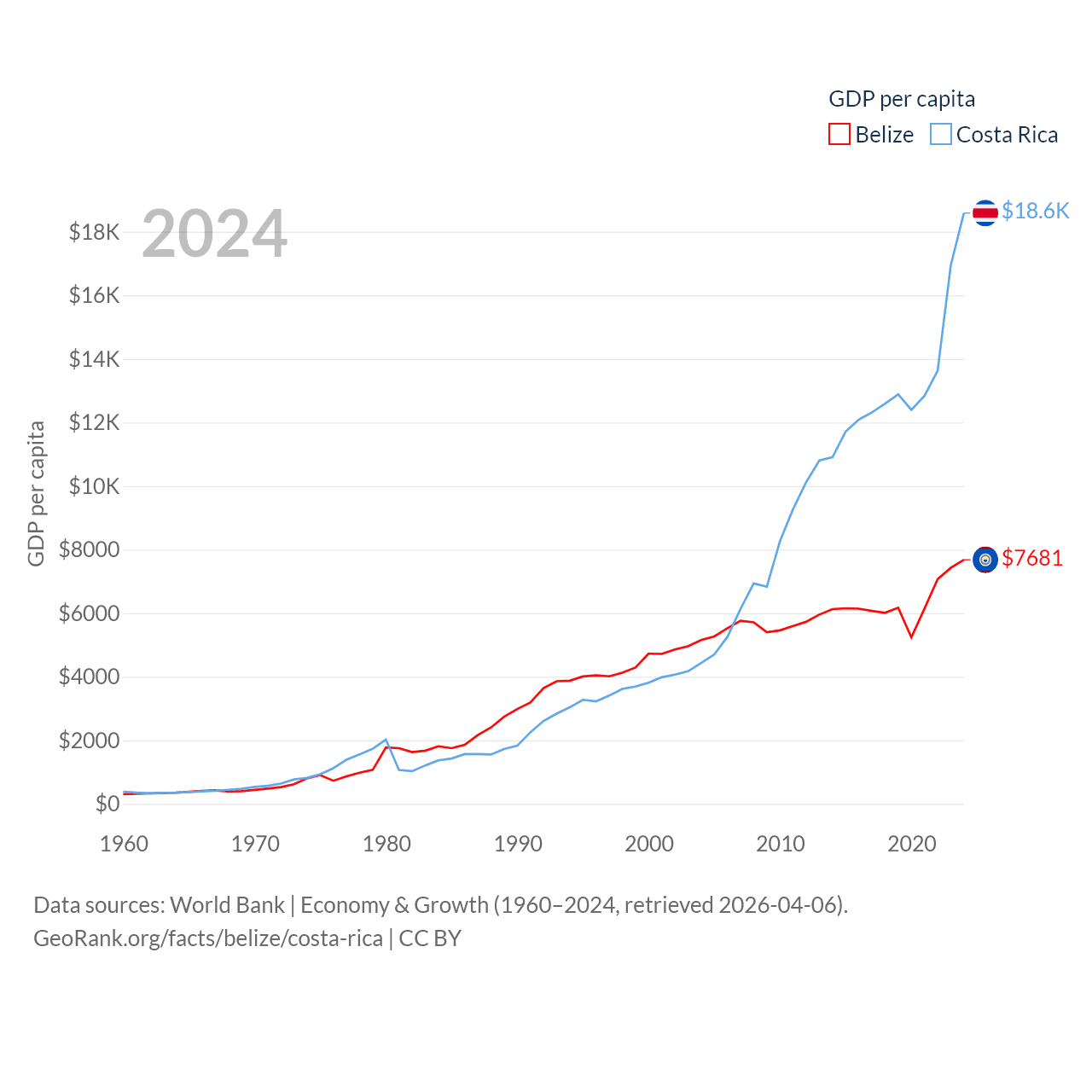 By GDP, Belize ranks 168/197 ($3.2B) and Costa Rica ranks 73/197 ($95.4B). By GDP per capita, Belize ranks 98/197 ($7,681), while Costa Rica ranks 62/197 ($18,587).