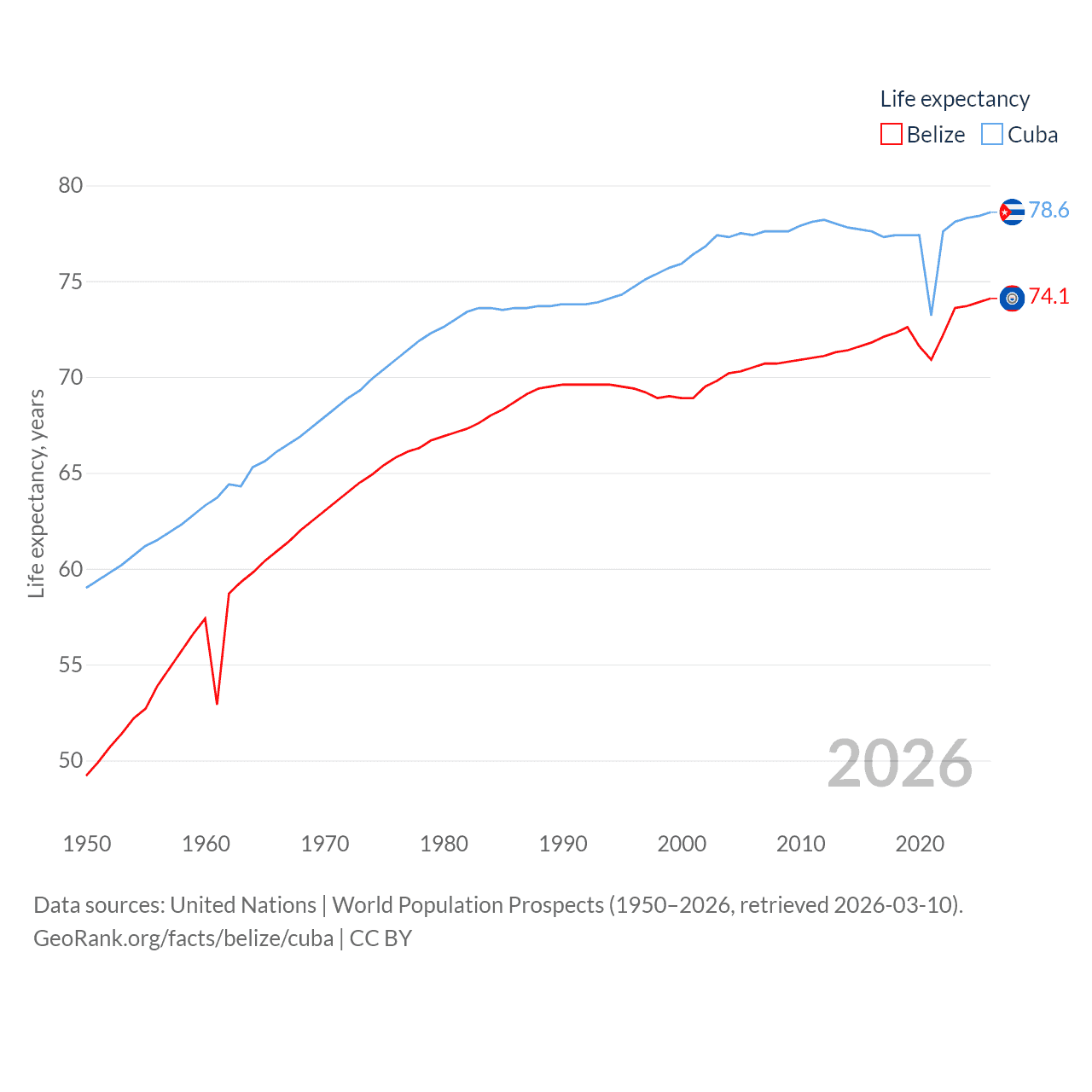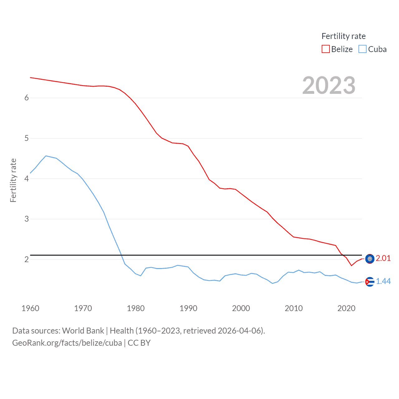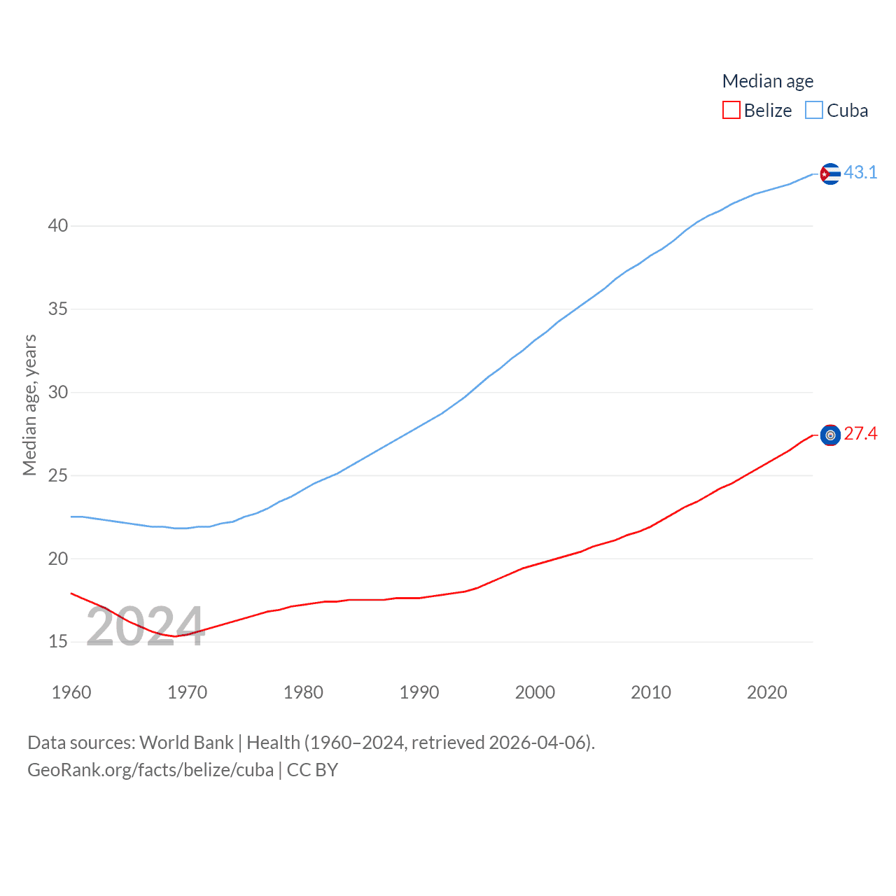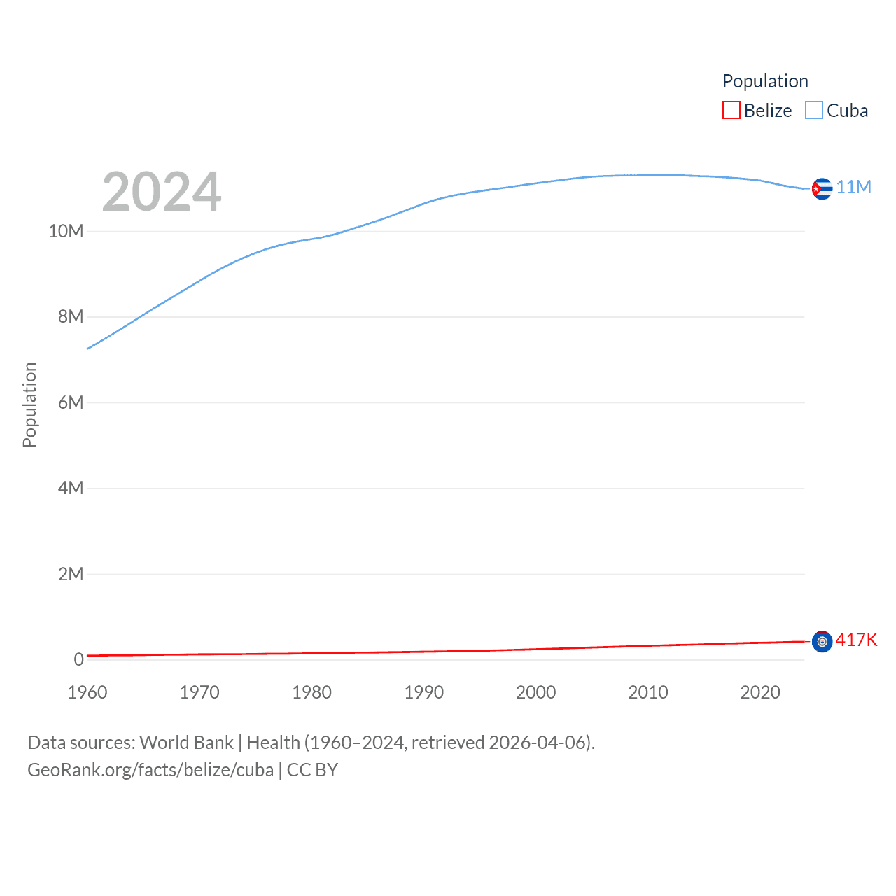 Belize has a population of 417K (ranked 171/197), compared with 11M in Cuba (ranked 87/197). Belize's land area is 8,807 sq mi versus 40,077 sq mi for Cuba (ranked 148th vs. 103rd).