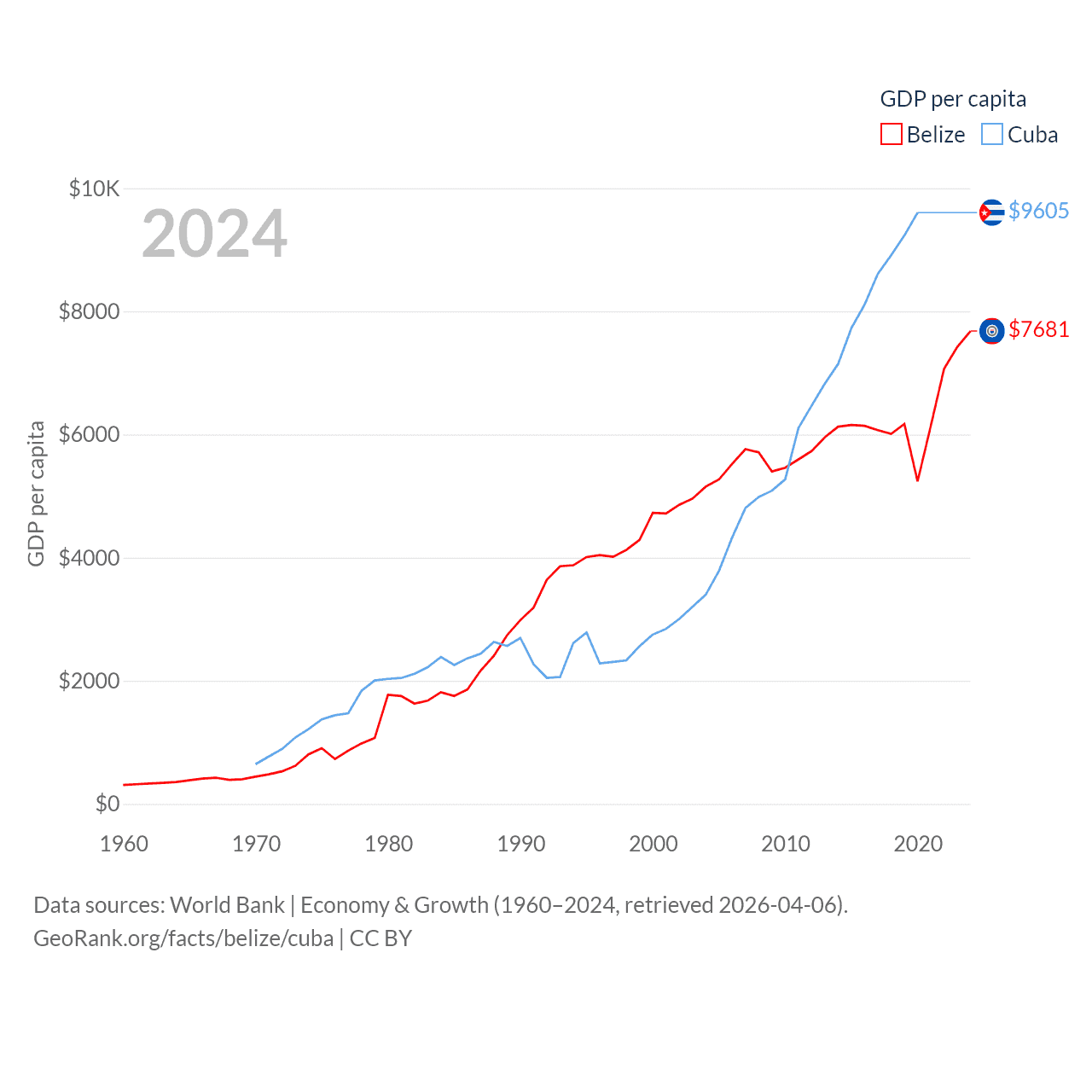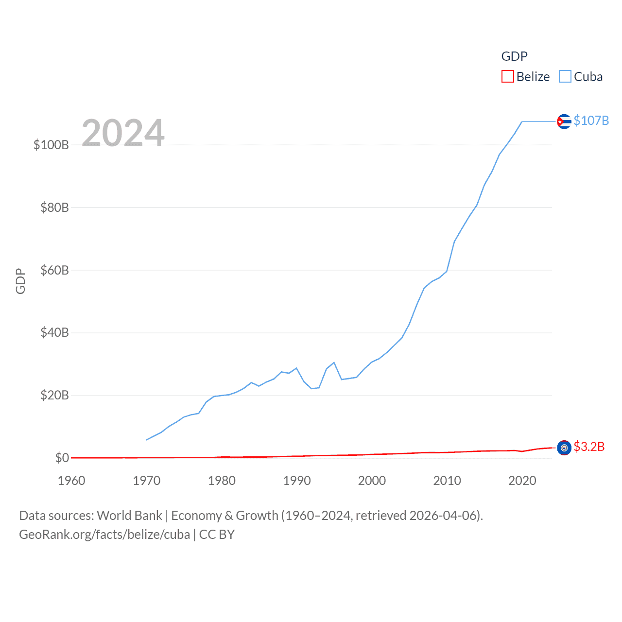 By GDP, Belize ranks 168/197 ($3.2B) and Cuba ranks 69/197 ($107B). By GDP per capita, Belize ranks 98/197 ($7,681), while Cuba ranks 86/197 ($9,605).
