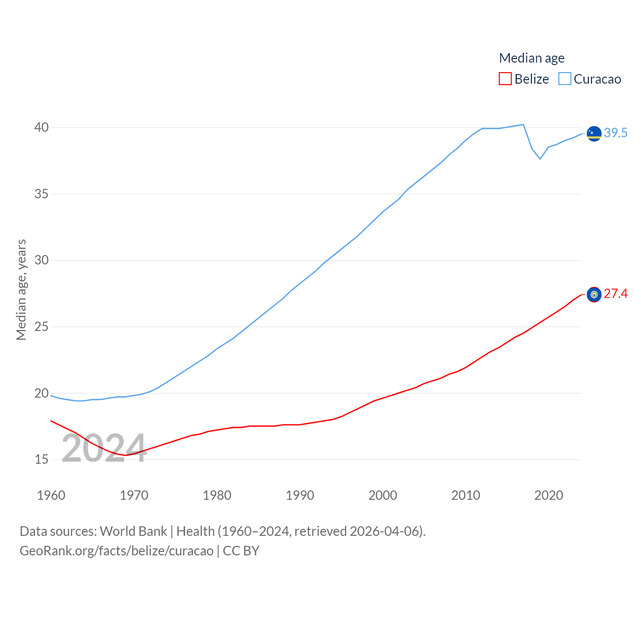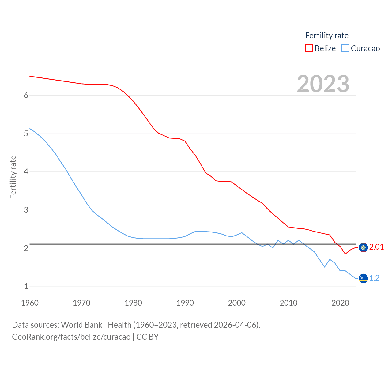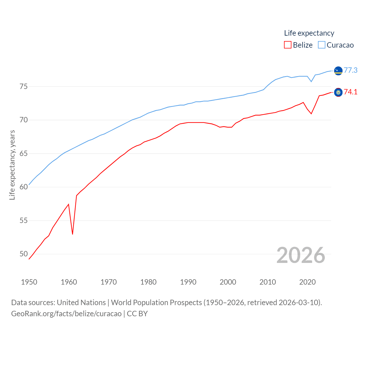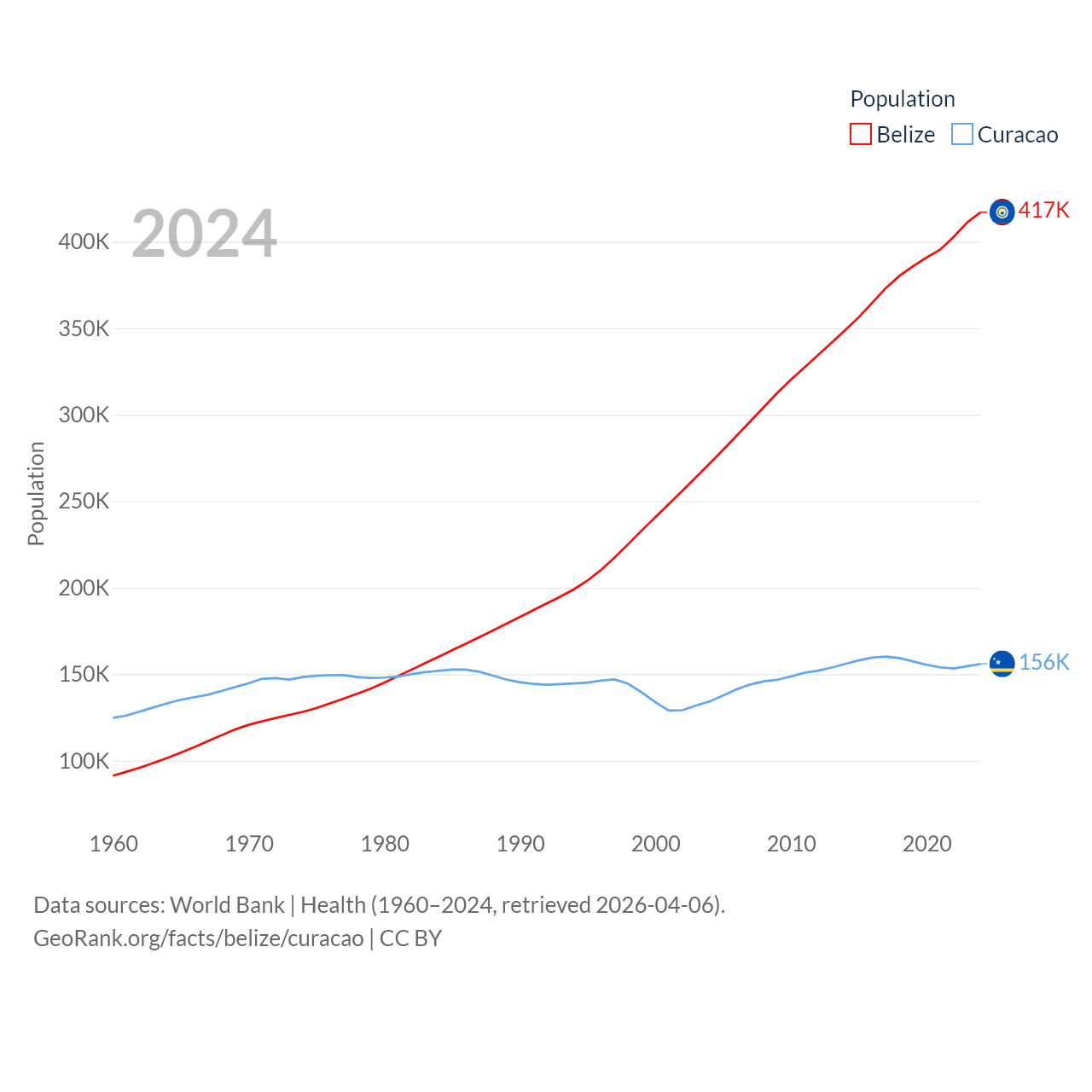 Belize has a population of 417K (ranked 171/197), compared with 156K in Curacao (ranked 179/197). Belize's land area is 8,807 sq mi versus 171.4 sq mi for Curacao (ranked 148th vs. 182nd).