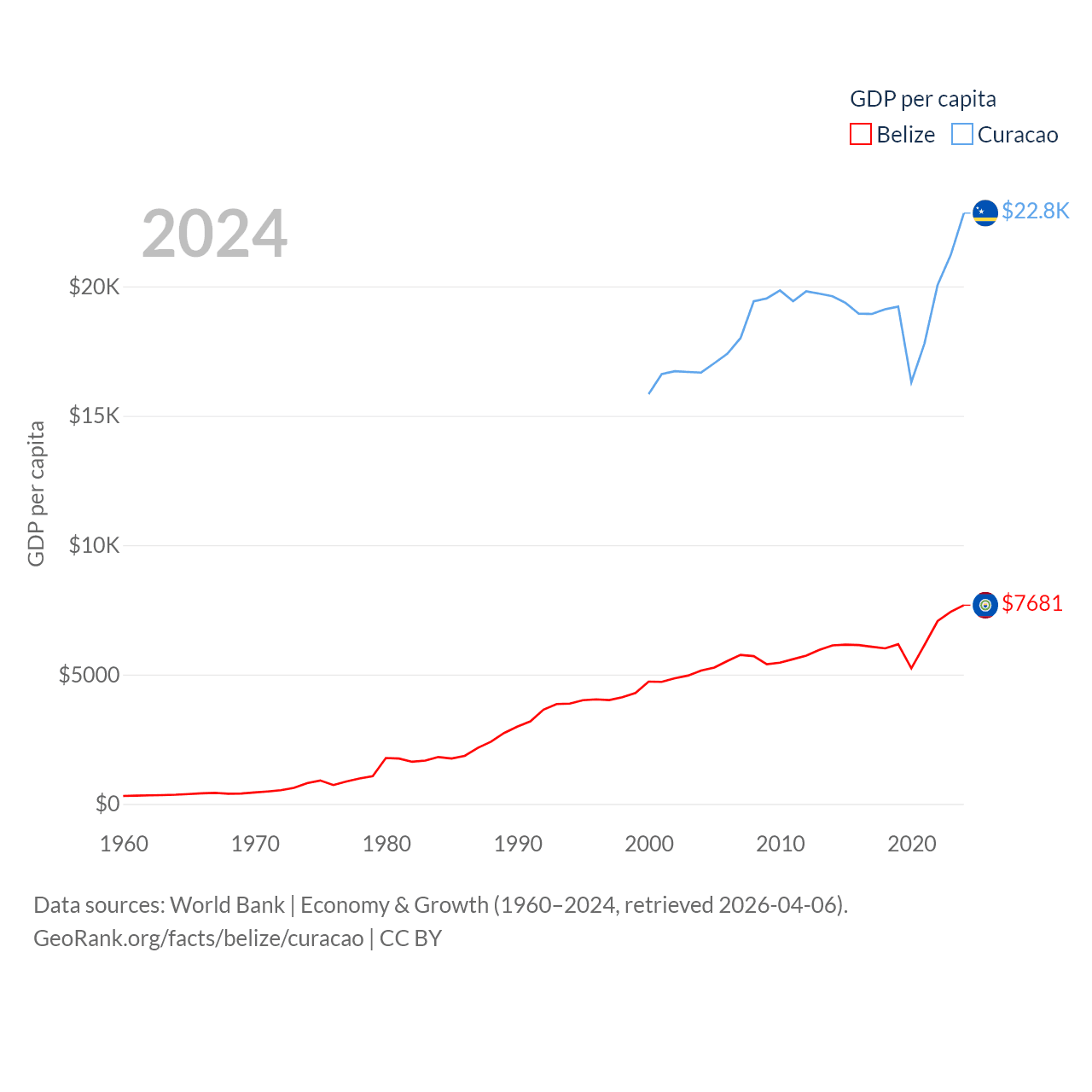 By GDP, Belize ranks 168/197 ($3.2B) and Curacao ranks 167/197 ($3.56B). By GDP per capita, Belize ranks 98/197 ($7,681), while Curacao ranks 56/197 ($22,833).