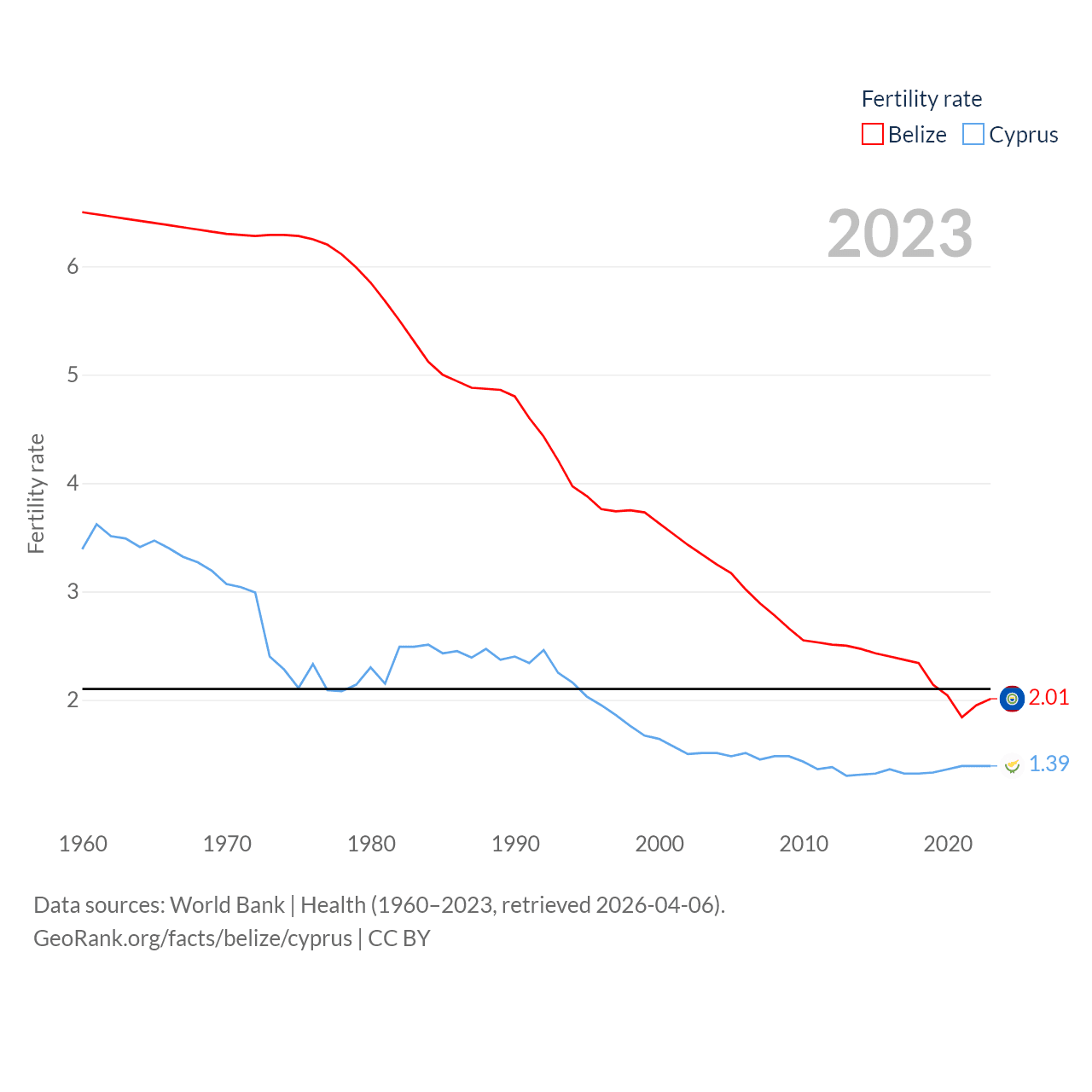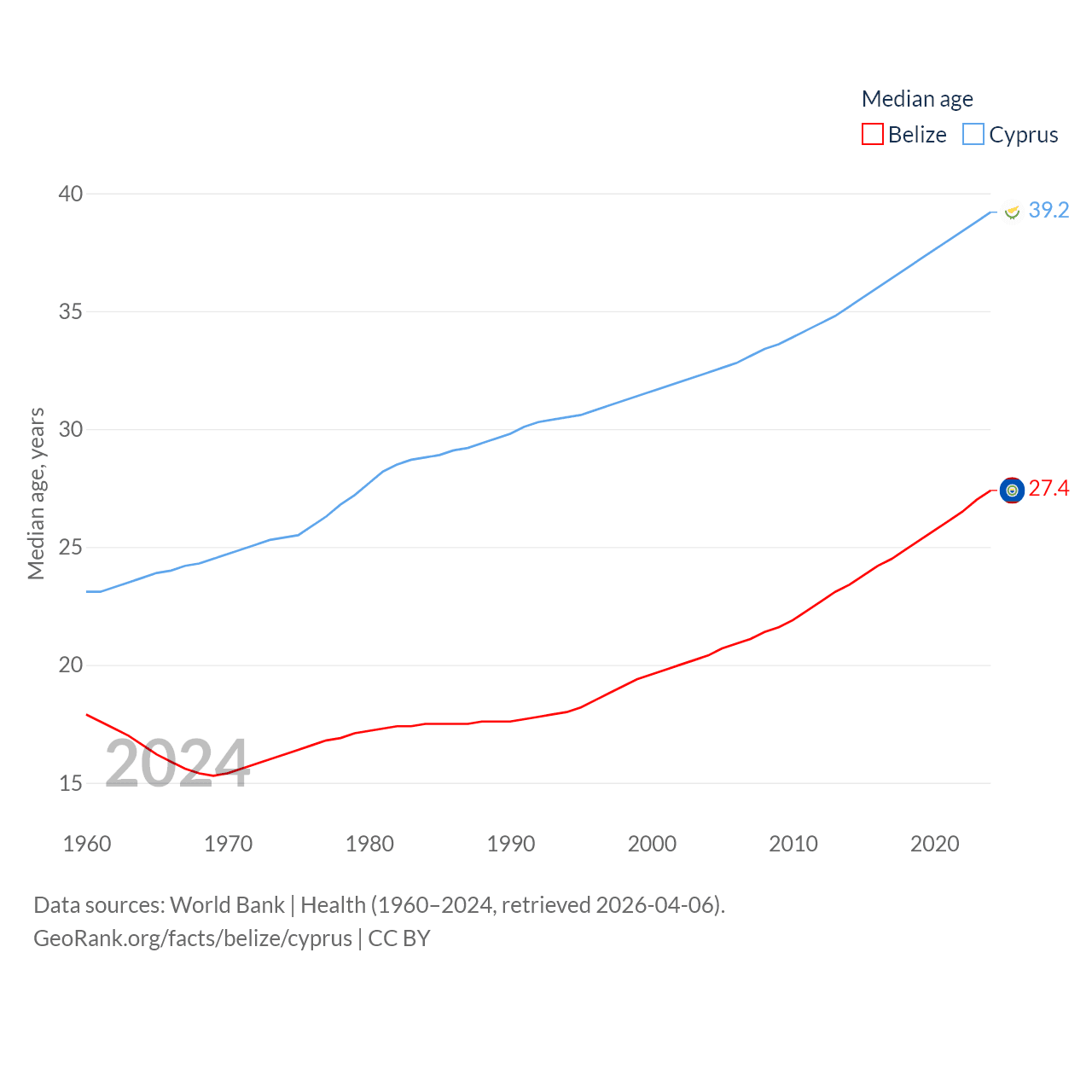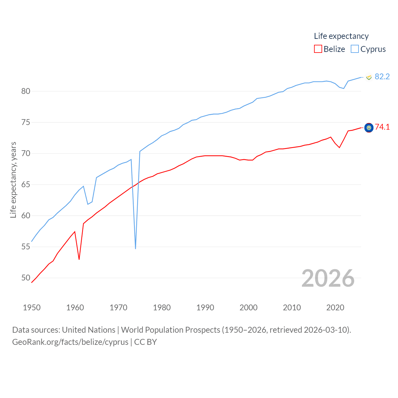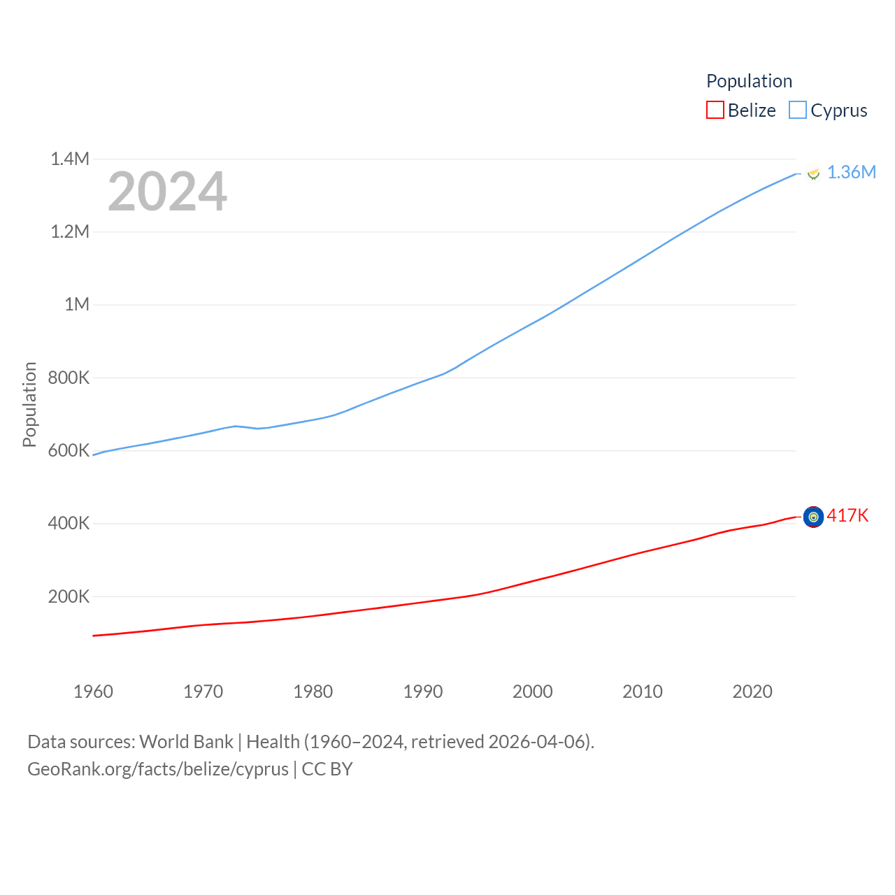 Belize has a population of 417K (ranked 171/197), compared with 1.36M in Cyprus (ranked 155/197). Belize's land area is 8,807 sq mi versus 3,568 sq mi for Cyprus (ranked 148th vs. 163rd).