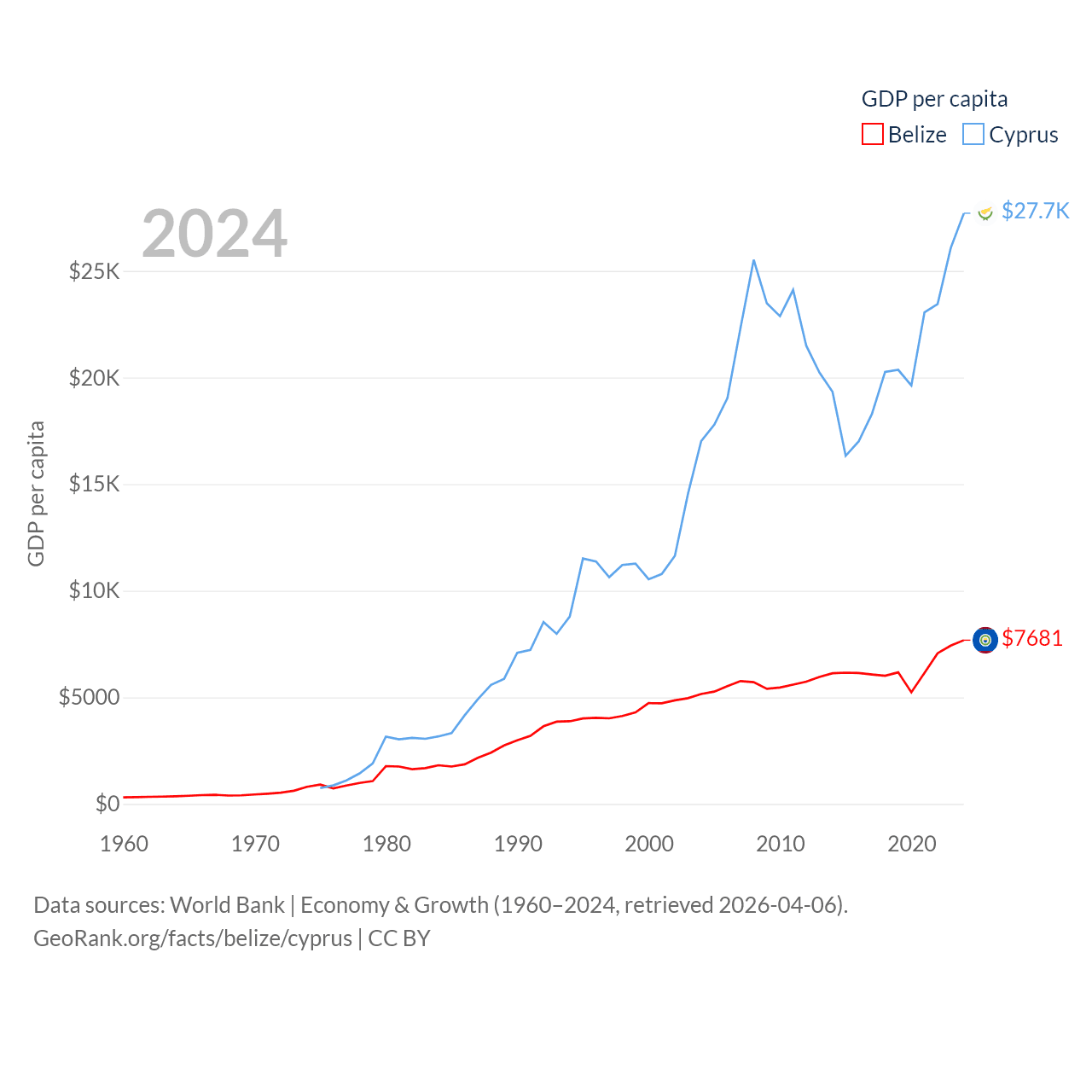 By GDP, Belize ranks 168/197 ($3.2B) and Cyprus ranks 103/197 ($37.6B). By GDP per capita, Belize ranks 98/197 ($7,681), while Cyprus ranks 45/197 ($27,707).