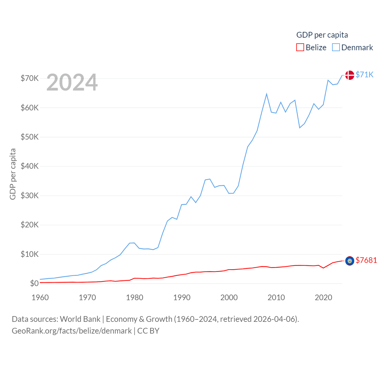 By GDP, Belize ranks 168/197 ($3.2B) and Denmark ranks 37/197 ($425B). By GDP per capita, Belize ranks 98/197 ($7,681), while Denmark ranks 12/197 ($71,026).