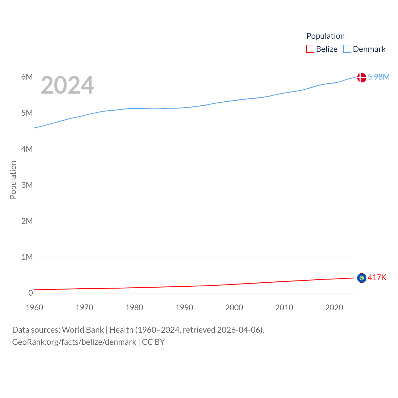 Belize has a population of 417K (ranked 171/197), compared with 5.98M in Denmark (ranked 114/197). Belize's land area is 8,807 sq mi versus 15,444 sq mi for Denmark (ranked 148th vs. 130th).