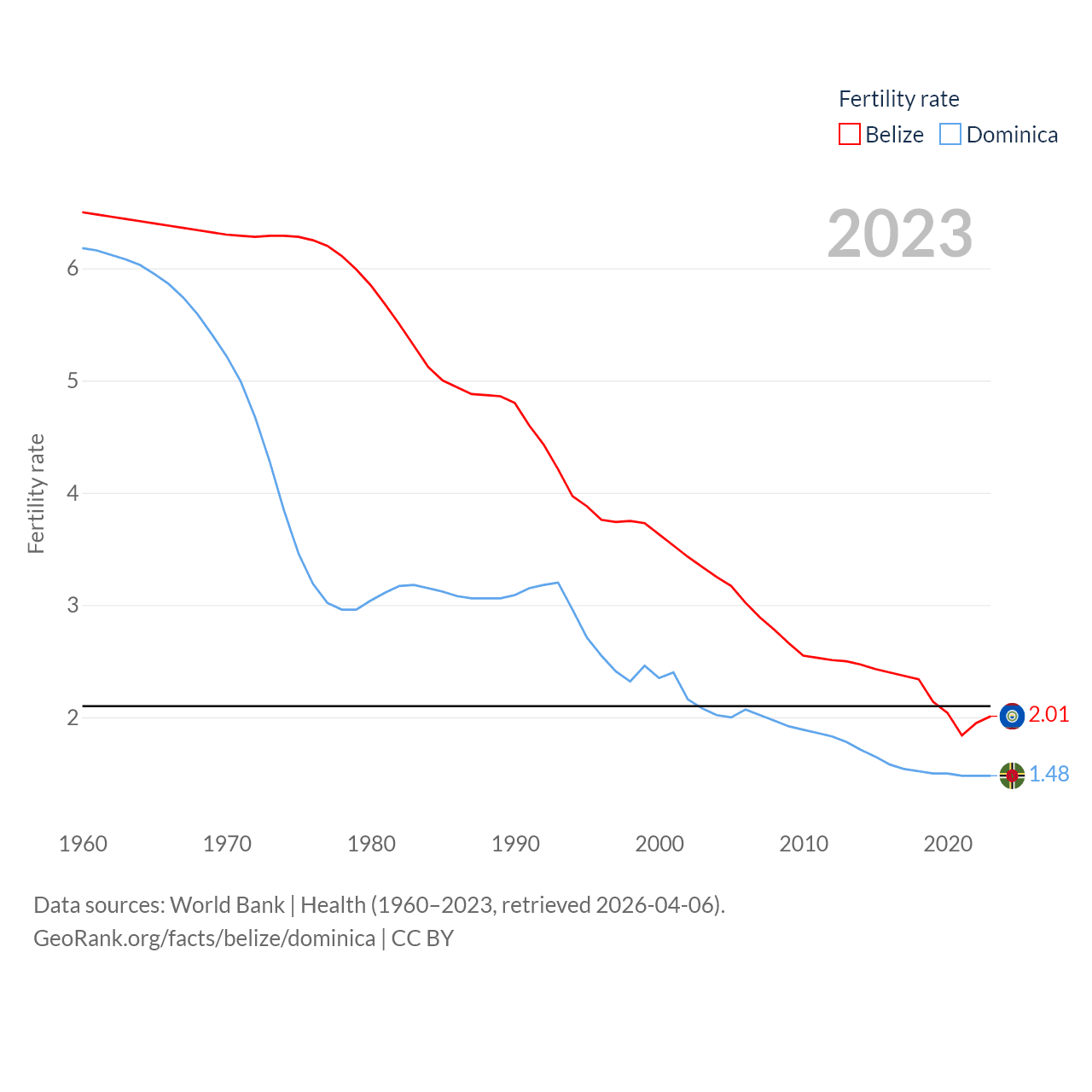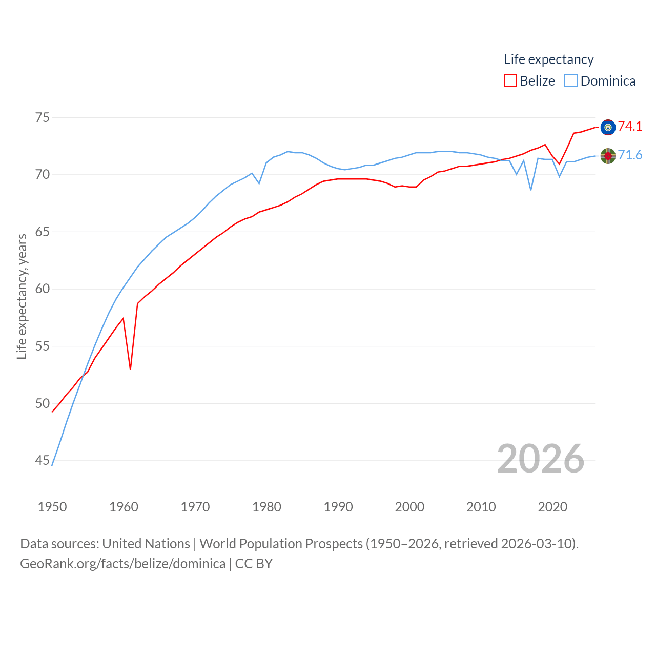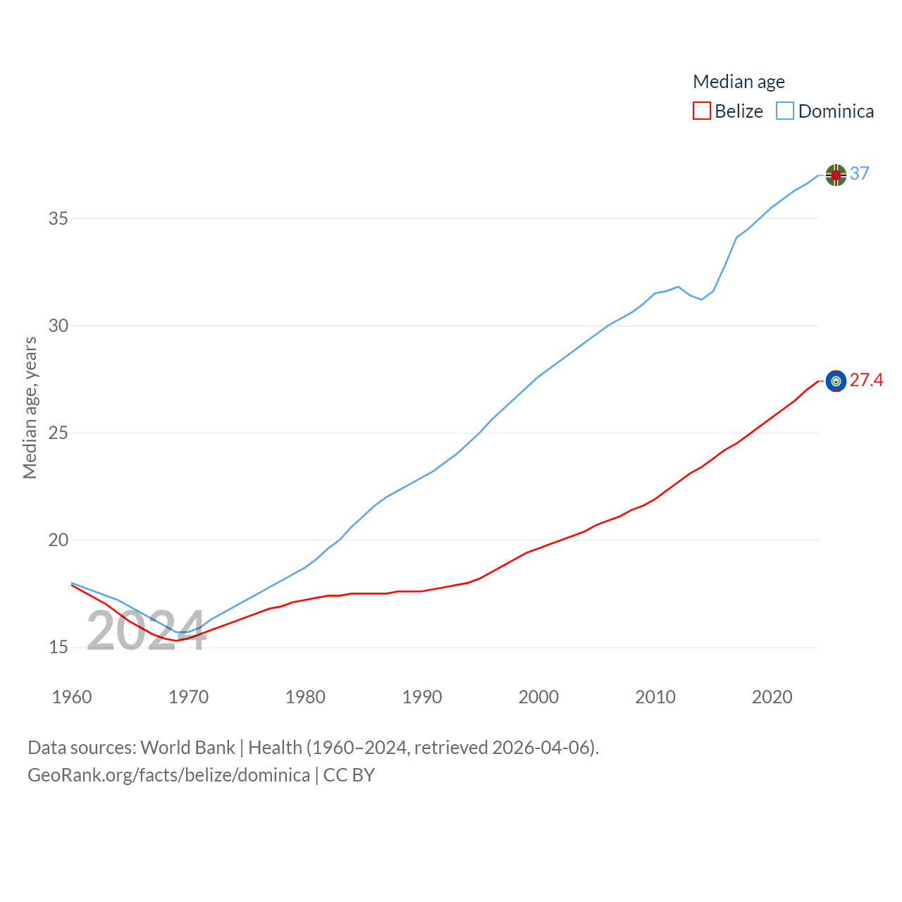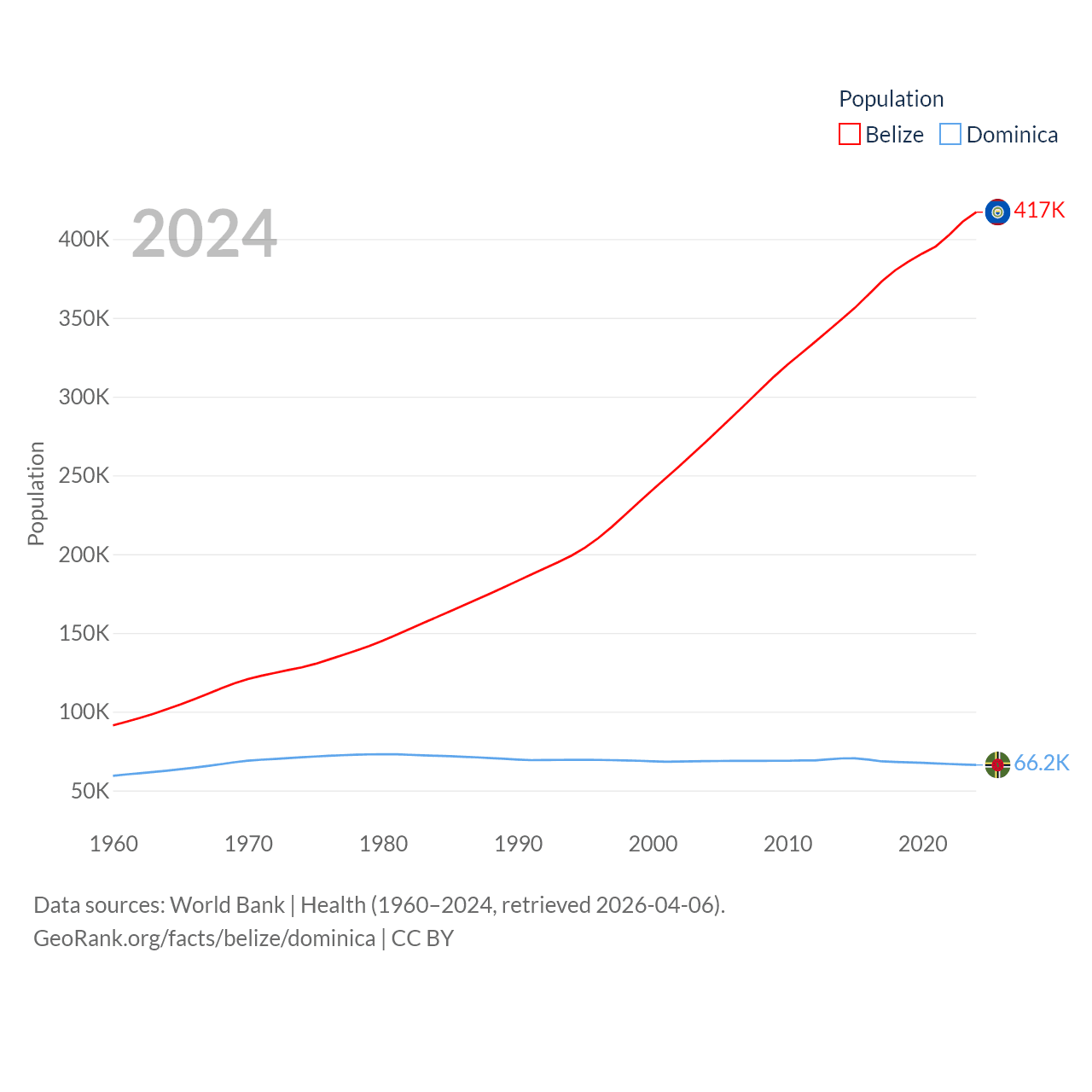 Belize has a population of 417K (ranked 171/197), compared with 66.2K in Dominica (ranked 188/197). Belize's land area is 8,807 sq mi versus 289.6 sq mi for Dominica (ranked 148th vs. 175th).