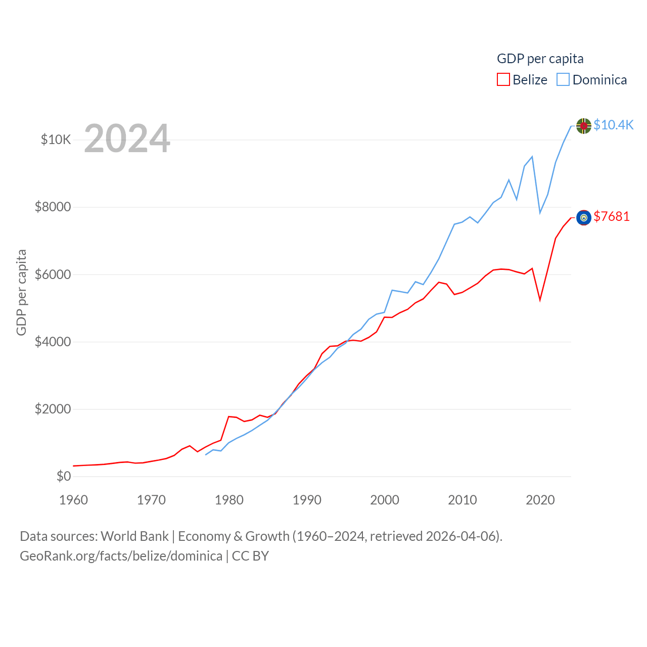 By GDP, Belize ranks 168/197 ($3.2B) and Dominica ranks 190/197 ($689M). By GDP per capita, Belize ranks 98/197 ($7,681), while Dominica ranks 84/197 ($10,405).