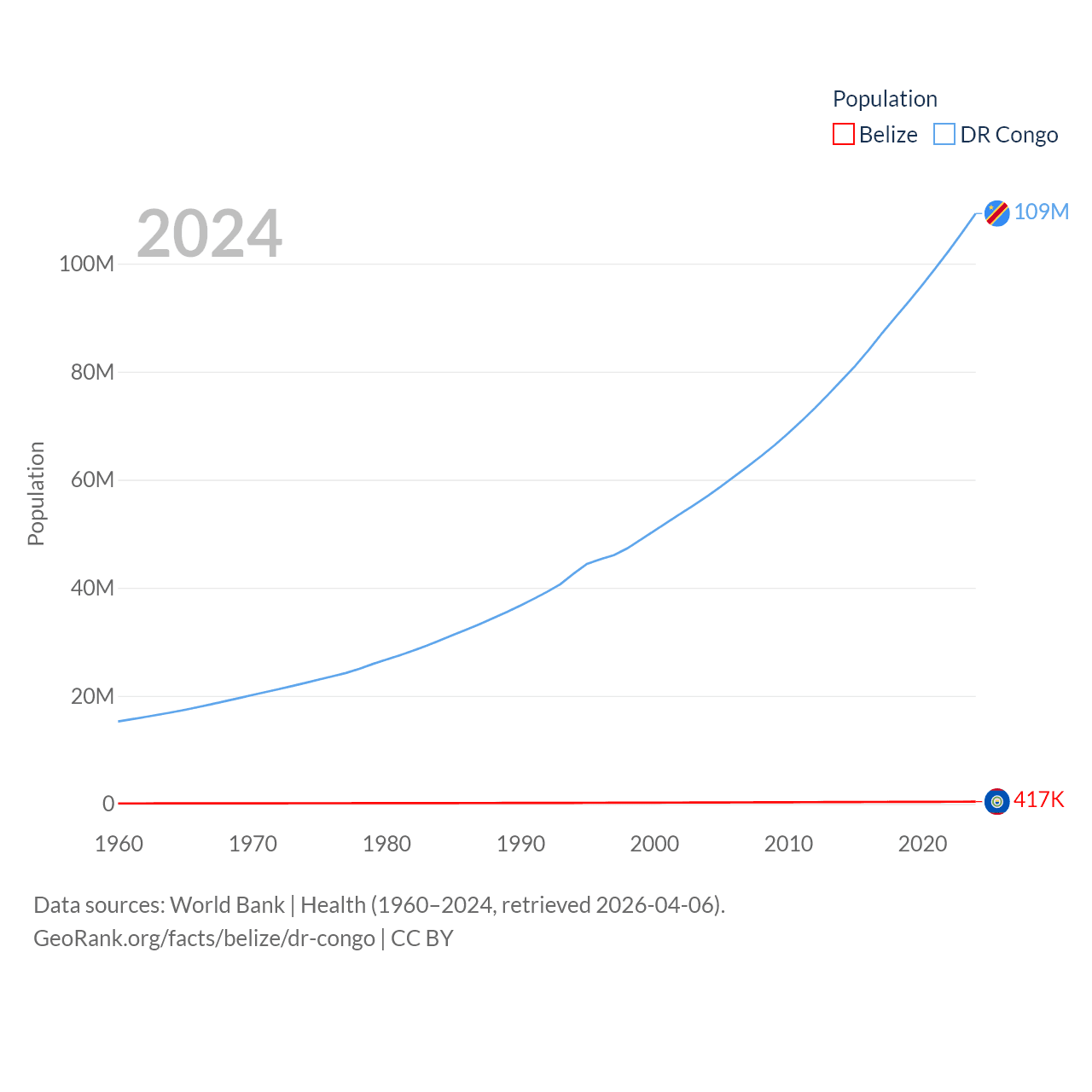 Belize has a population of 417K (ranked 171/197), compared with 109M in The DR Congo (ranked 15/197). Belize's land area is 8,807 sq mi versus 875,313 sq mi for The DR Congo (ranked 148th vs. 11th).
