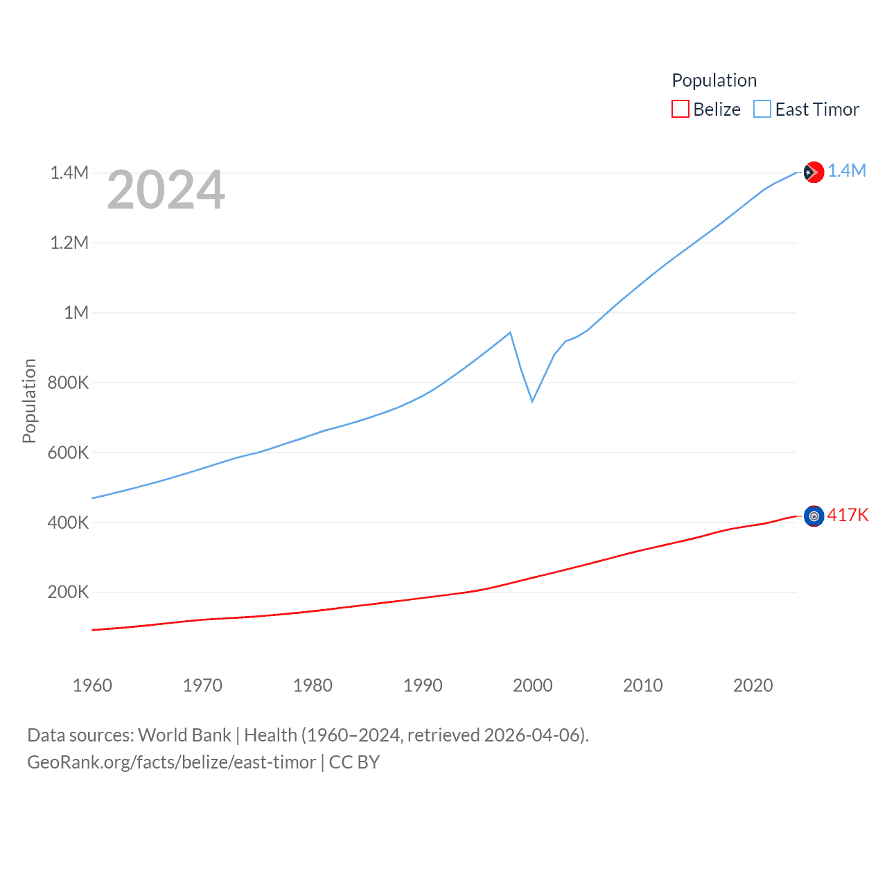 Belize has a population of 417K (ranked 171/197), compared with 1.4M in East Timor (ranked 152/197). Belize's land area is 8,807 sq mi versus 5,741 sq mi for East Timor (ranked 148th vs. 155th).