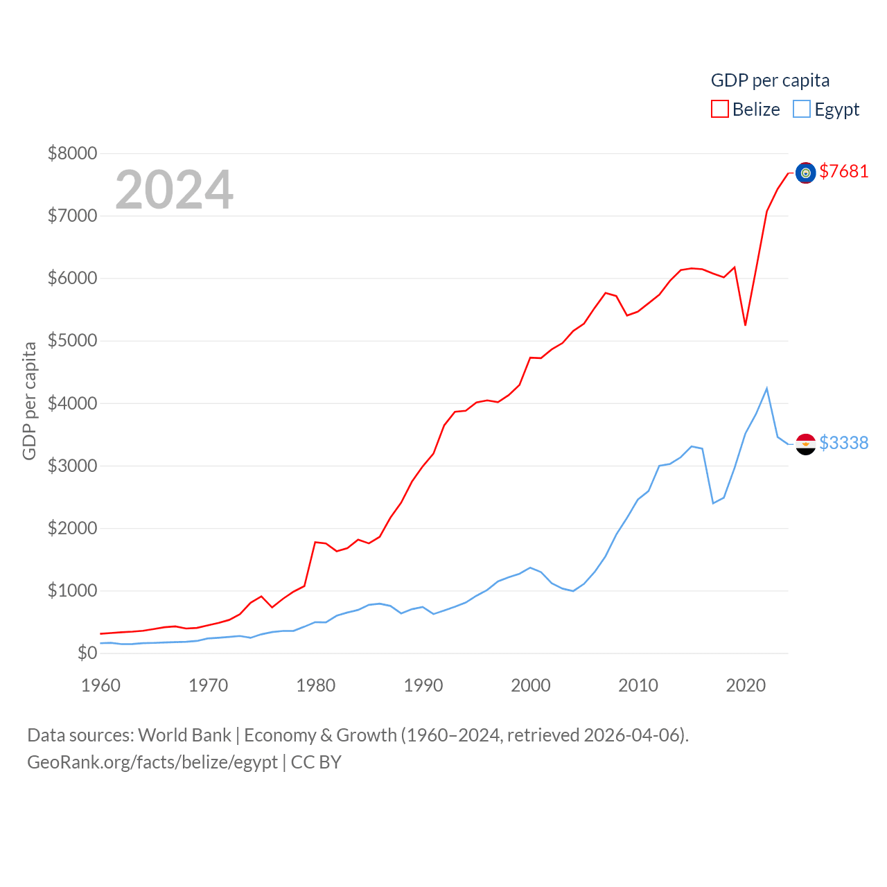By GDP, Belize ranks 168/197 ($3.2B) and Egypt ranks 41/197 ($389B). By GDP per capita, Belize ranks 98/197 ($7,681), while Egypt ranks 138/197 ($3,338).