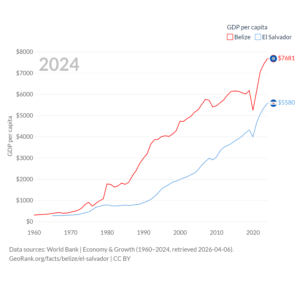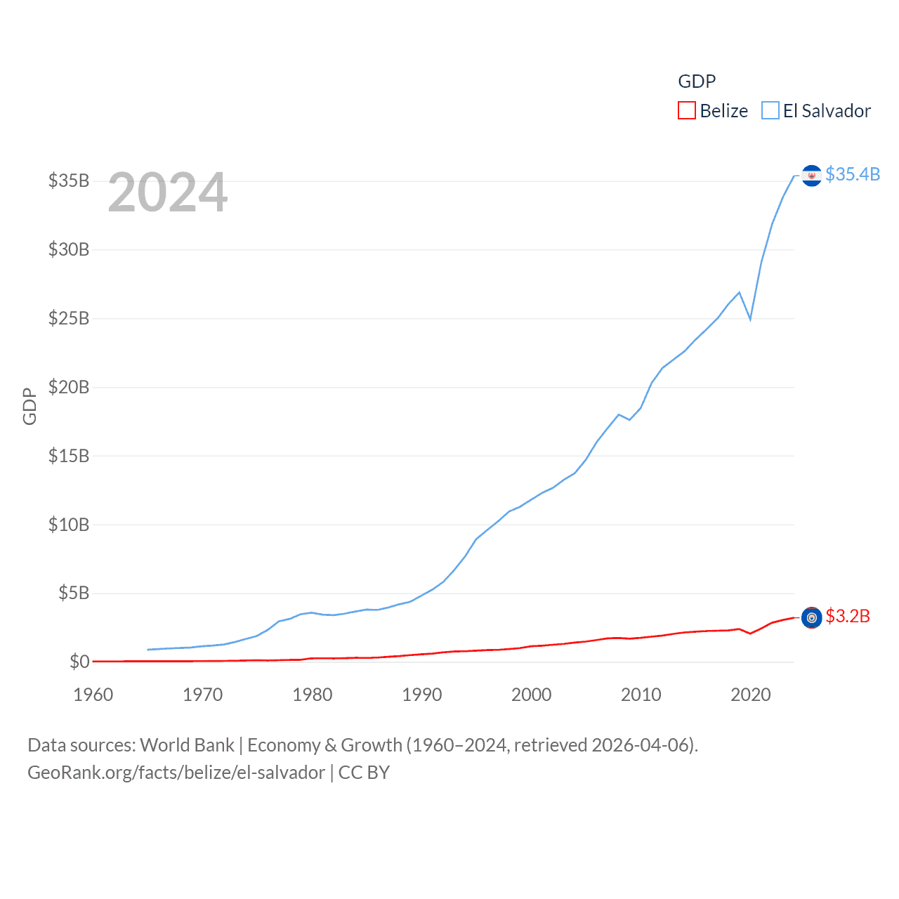 By GDP, Belize ranks 168/197 ($3.2B) and El Salvador ranks 105/197 ($35.4B). By GDP per capita, Belize ranks 98/197 ($7,681), while El Salvador ranks 116/197 ($5,580).