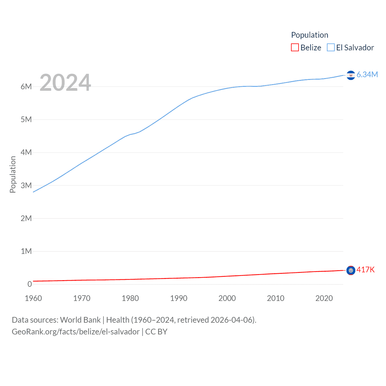 Belize has a population of 417K (ranked 171/197), compared with 6.34M in El Salvador (ranked 111/197). Belize's land area is 8,807 sq mi versus 8,000 sq mi for El Salvador (ranked 148th vs. 150th).