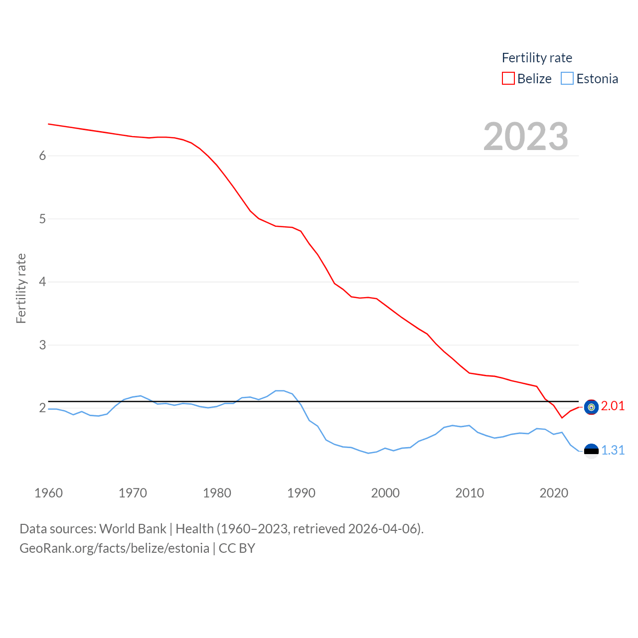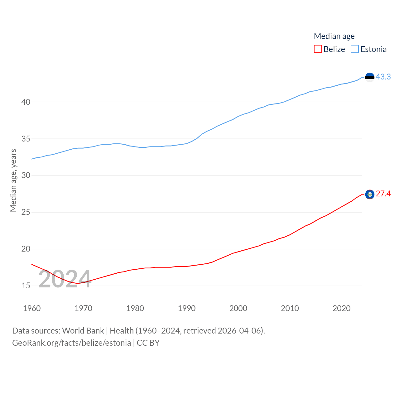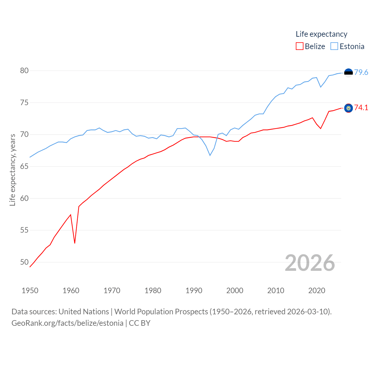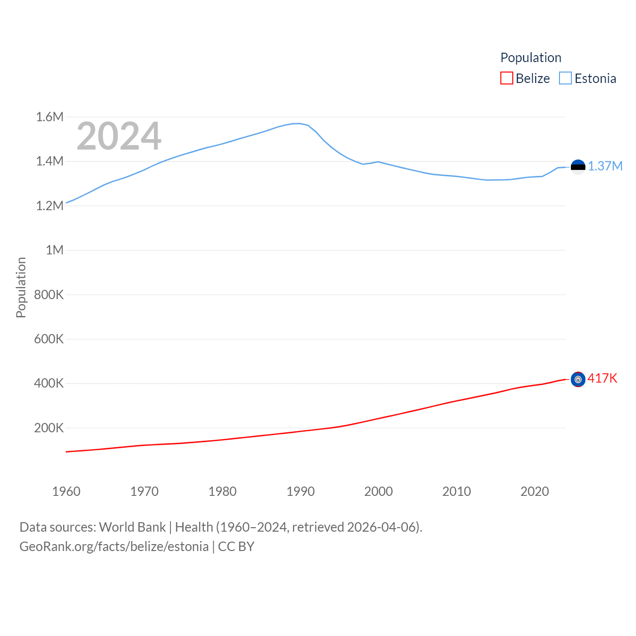 Belize has a population of 417K (ranked 171/197), compared with 1.37M in Estonia (ranked 153/197). Belize's land area is 8,807 sq mi versus 16,498 sq mi for Estonia (ranked 148th vs. 129th).