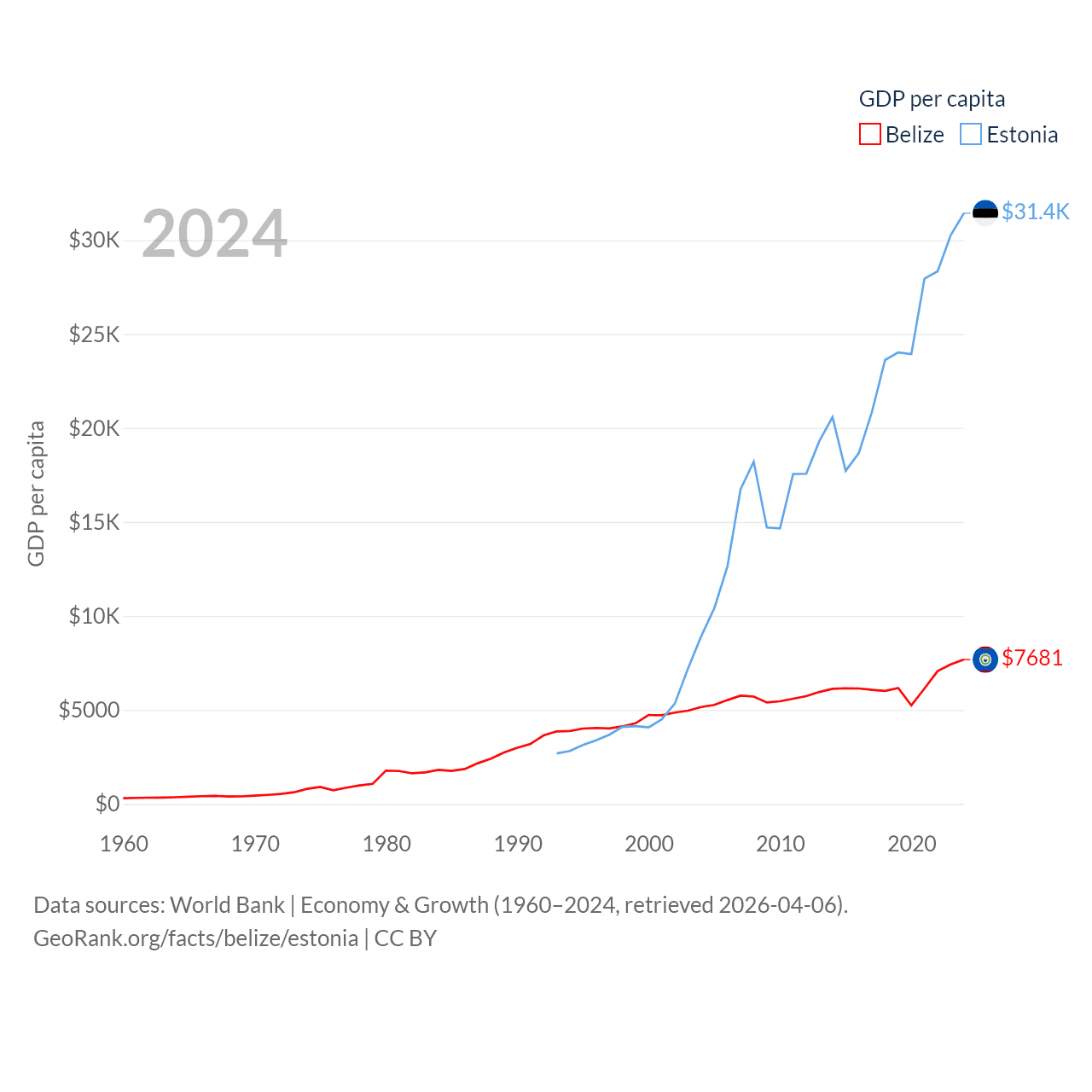 By GDP, Belize ranks 168/197 ($3.2B) and Estonia ranks 100/197 ($43.1B). By GDP per capita, Belize ranks 98/197 ($7,681), while Estonia ranks 40/197 ($31,428).