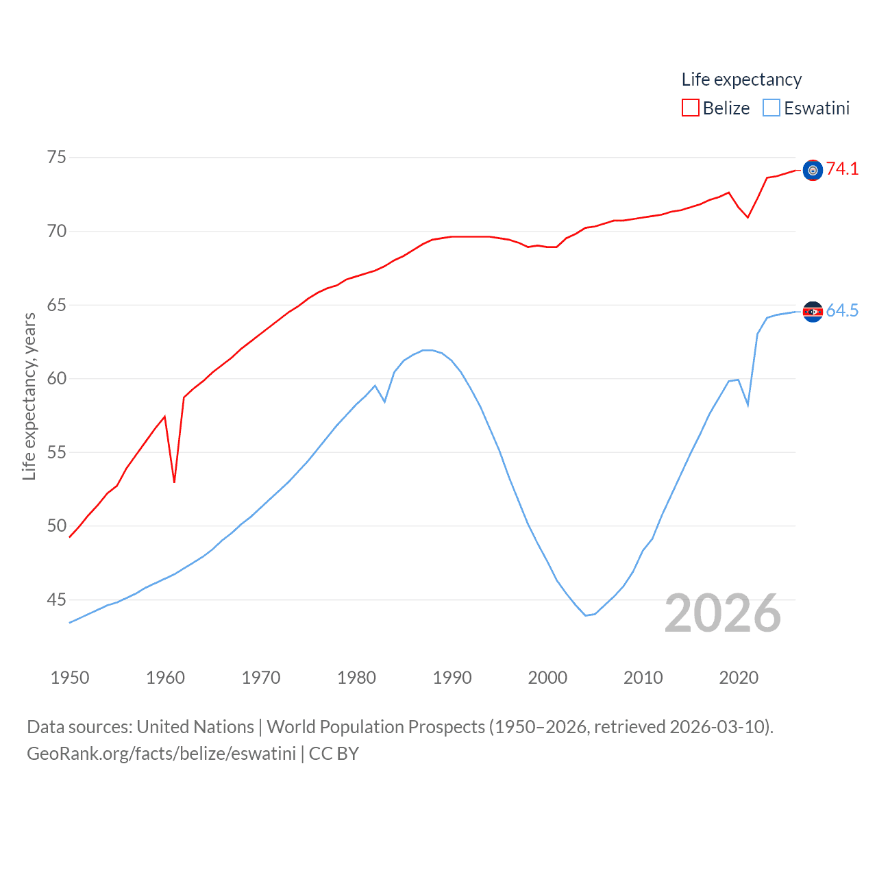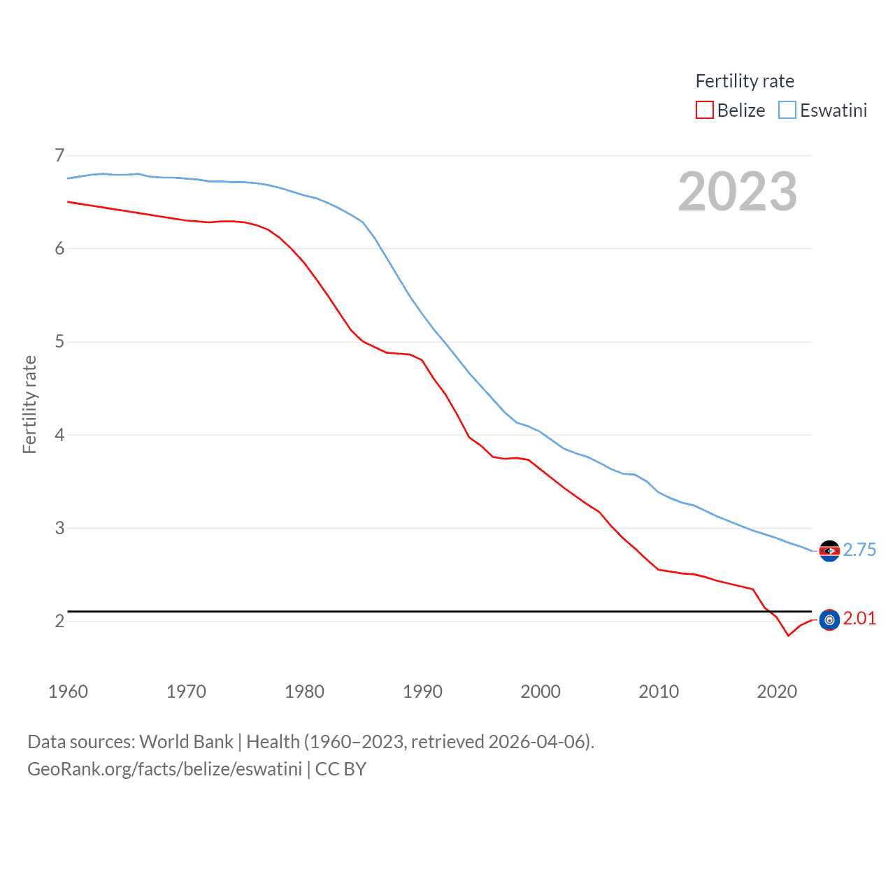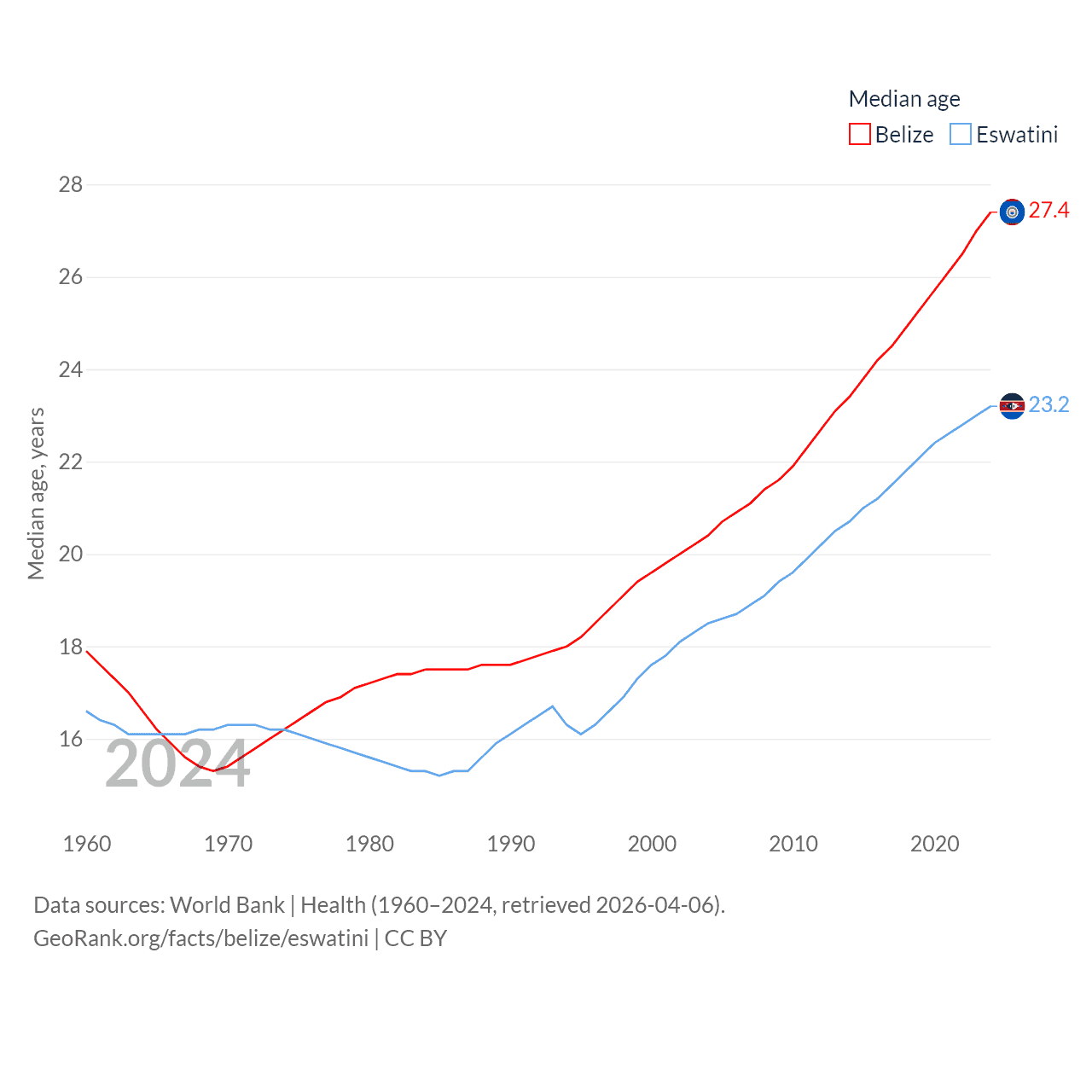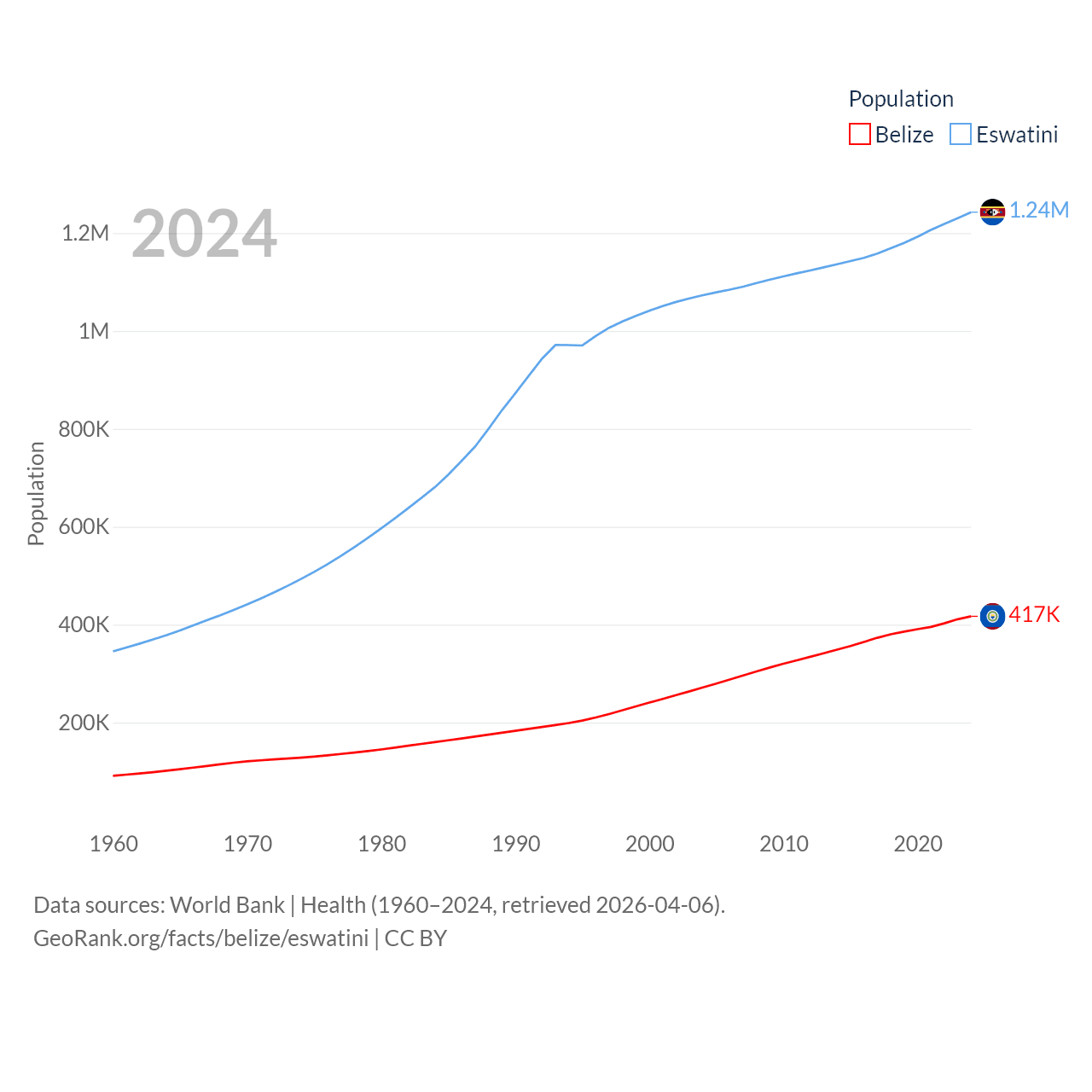 Belize has a population of 417K (ranked 171/197), compared with 1.24M in Eswatini (ranked 157/197). Belize's land area is 8,807 sq mi versus 6,641 sq mi for Eswatini (ranked 148th vs. 154th).