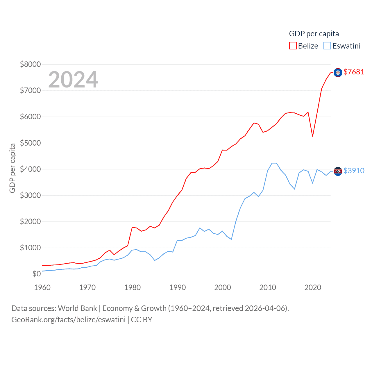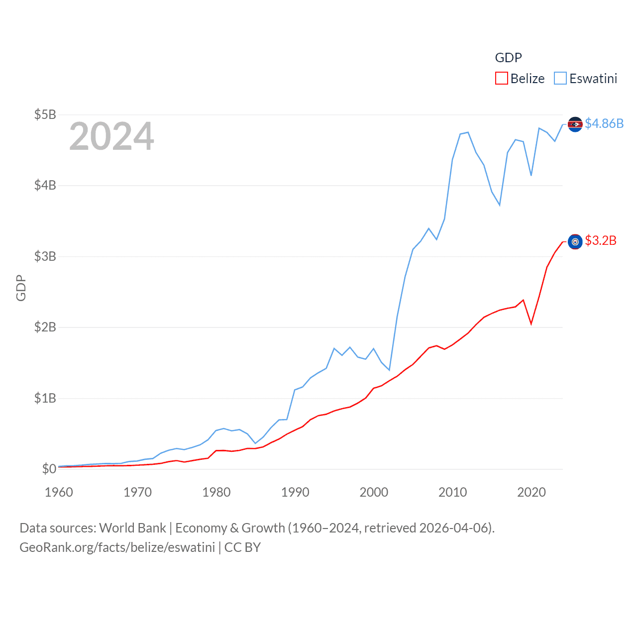 By GDP, Belize ranks 168/197 ($3.2B) and Eswatini ranks 162/197 ($4.86B). By GDP per capita, Belize ranks 98/197 ($7,681), while Eswatini ranks 131/197 ($3,910).