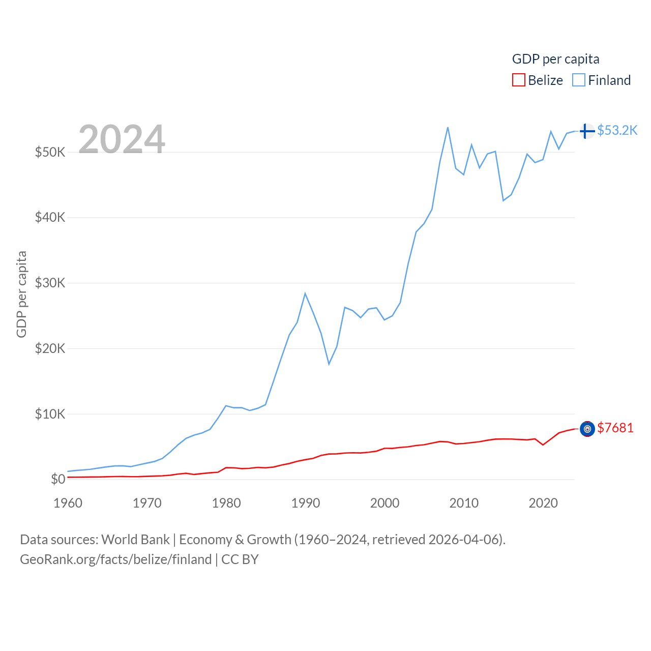 By GDP, Belize ranks 168/197 ($3.2B) and Finland ranks 47/197 ($299B). By GDP per capita, Belize ranks 98/197 ($7,681), while Finland ranks 23/197 ($53,150).