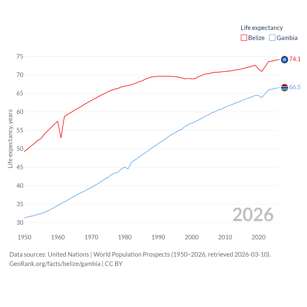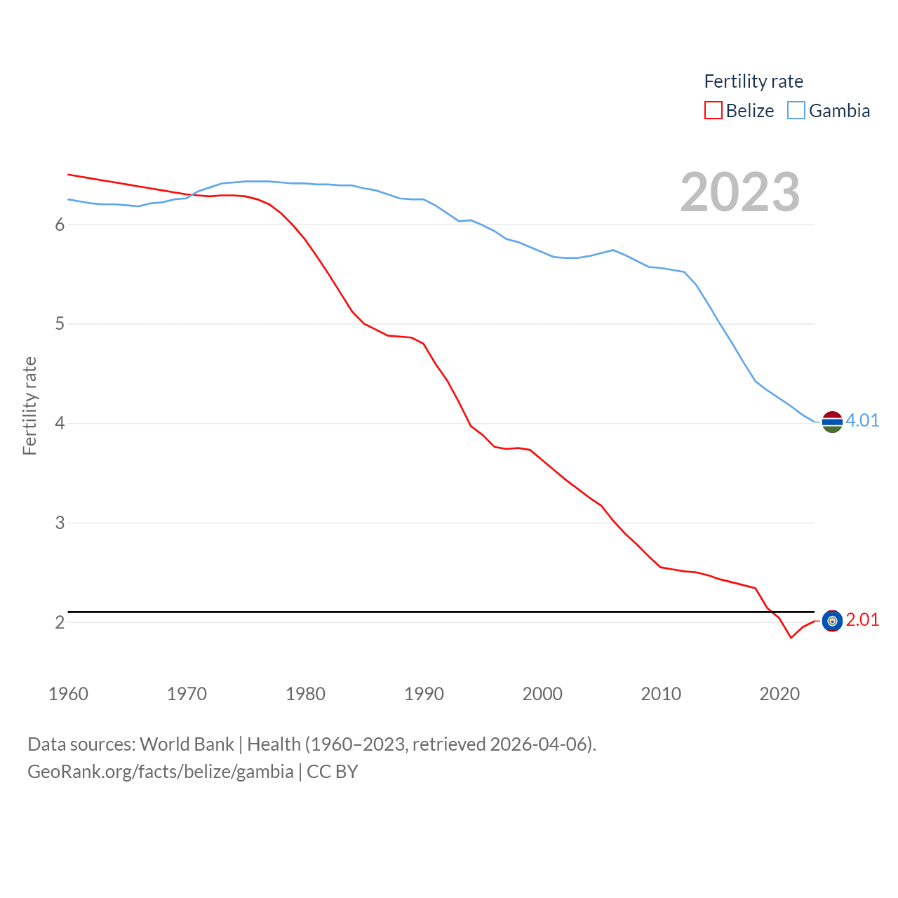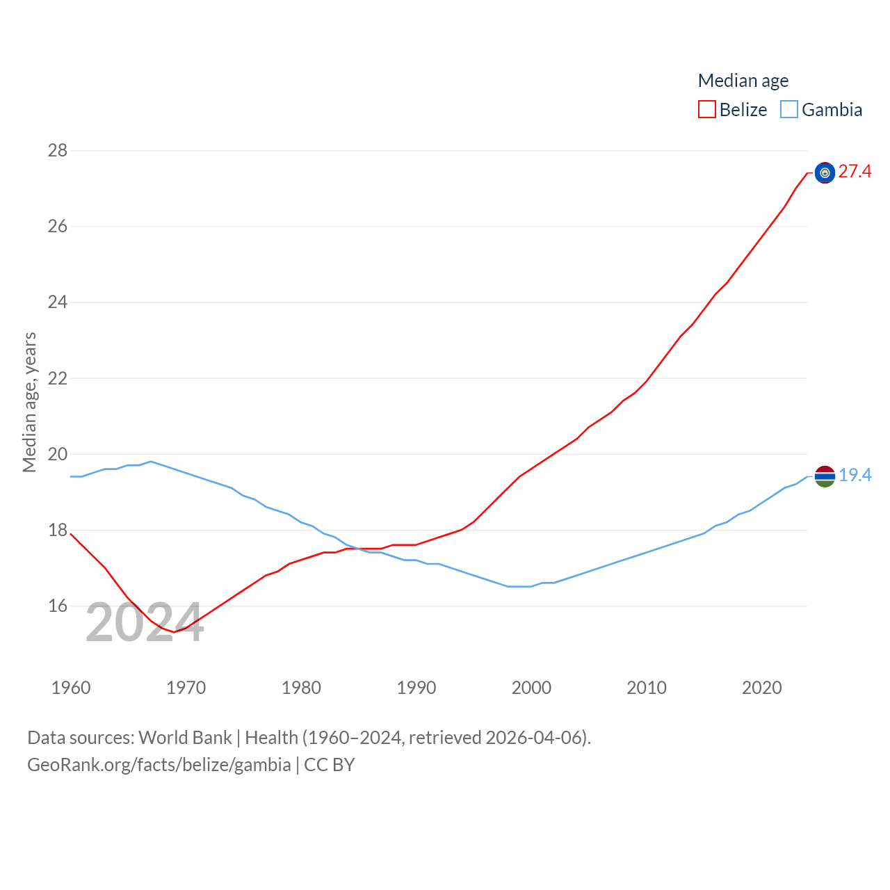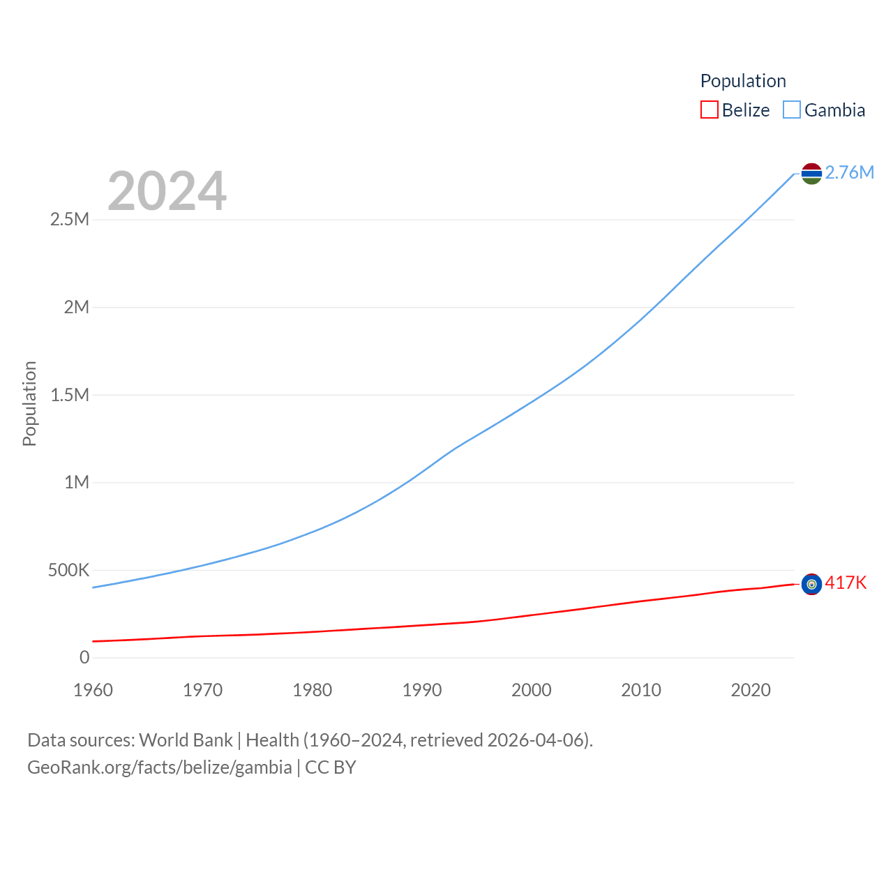 Belize has a population of 417K (ranked 171/197), compared with 2.76M in The Gambia (ranked 140/197). Belize's land area is 8,807 sq mi versus 3,907 sq mi for The Gambia (ranked 148th vs. 161st).