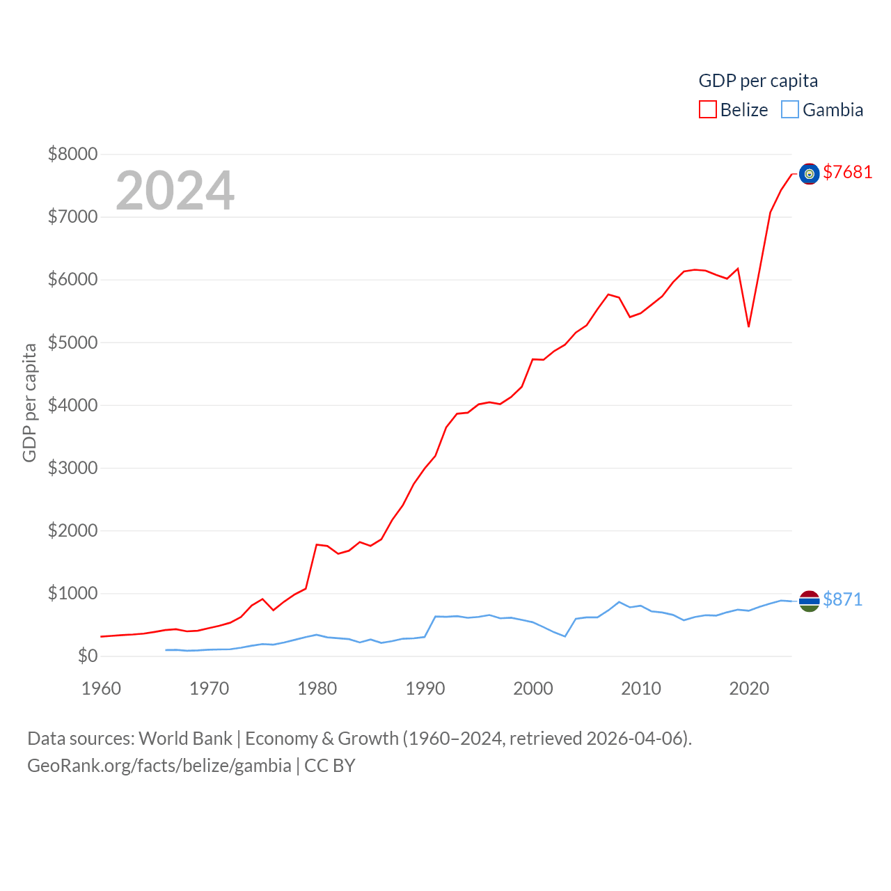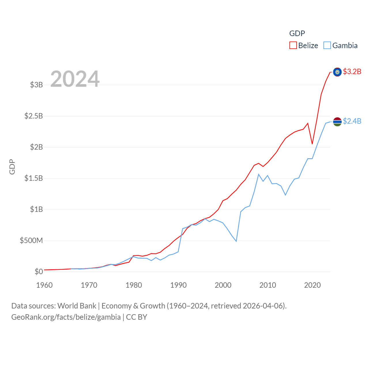 By GDP, Belize ranks 168/197 ($3.2B) and The Gambia ranks 174/197 ($2.4B). By GDP per capita, Belize ranks 98/197 ($7,681), while The Gambia ranks 183/197 ($871).