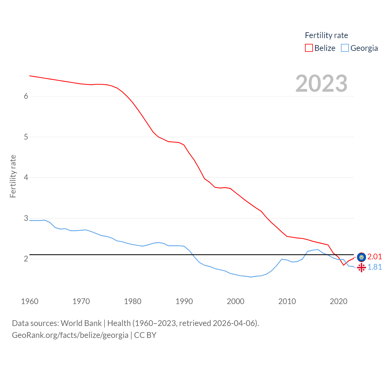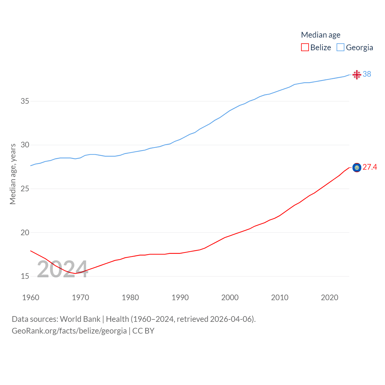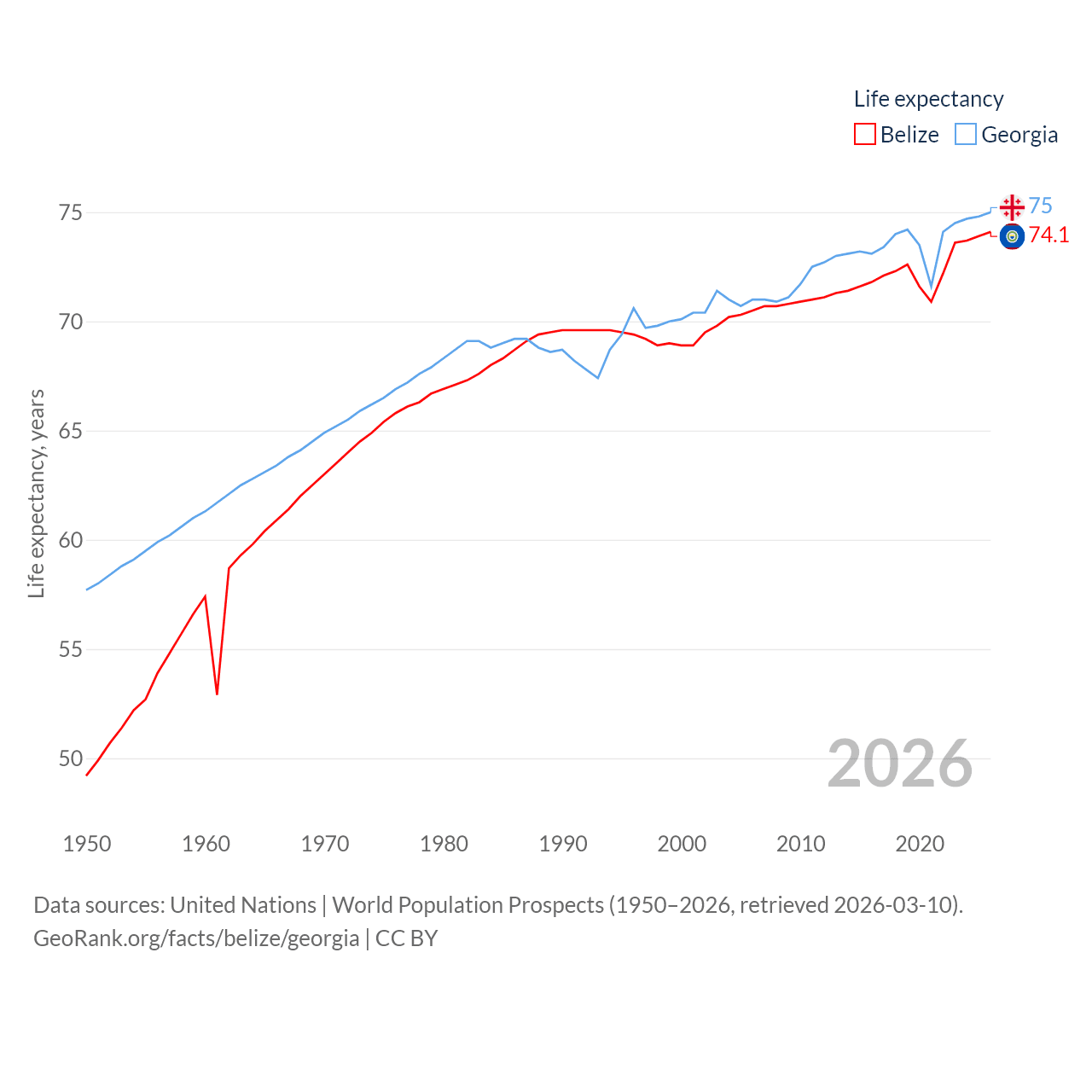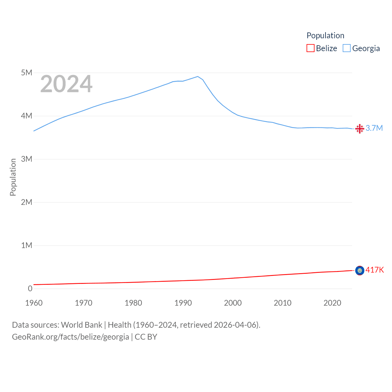 Belize has a population of 417K (ranked 171/197), compared with 3.7M in Georgia (ranked 130/197). Belize's land area is 8,807 sq mi versus 26,830 sq mi for Georgia (ranked 148th vs. 118th).