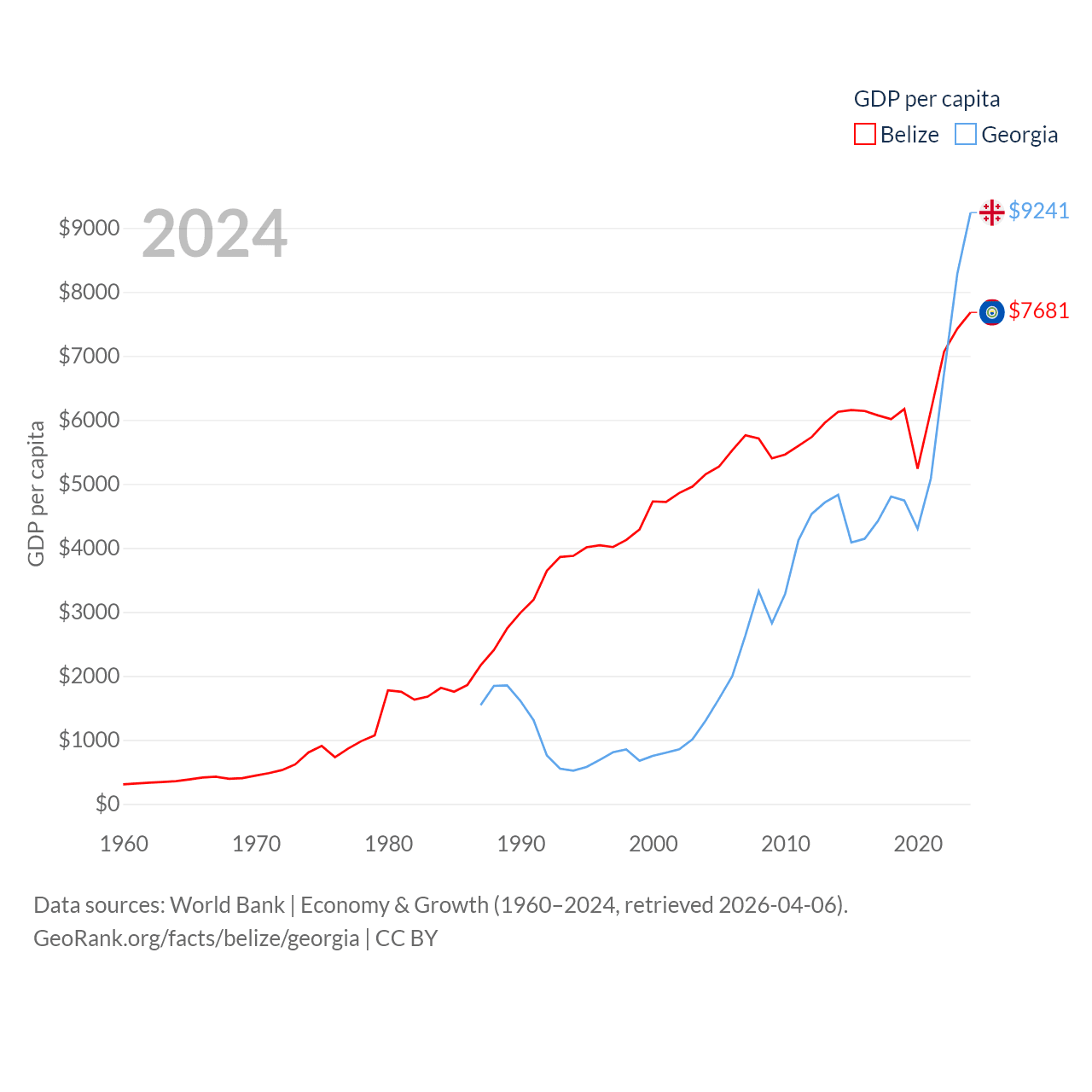 By GDP, Belize ranks 168/197 ($3.2B) and Georgia ranks 107/197 ($34.2B). By GDP per capita, Belize ranks 98/197 ($7,681), while Georgia ranks 89/197 ($9,241).