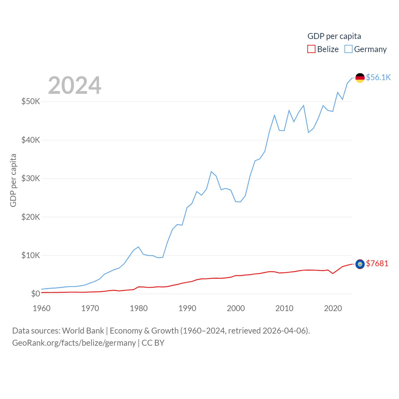 By GDP, Belize ranks 168/197 ($3.2B) and Germany ranks 3/197 ($4.69T). By GDP per capita, Belize ranks 98/197 ($7,681), while Germany ranks 19/197 ($56,104).