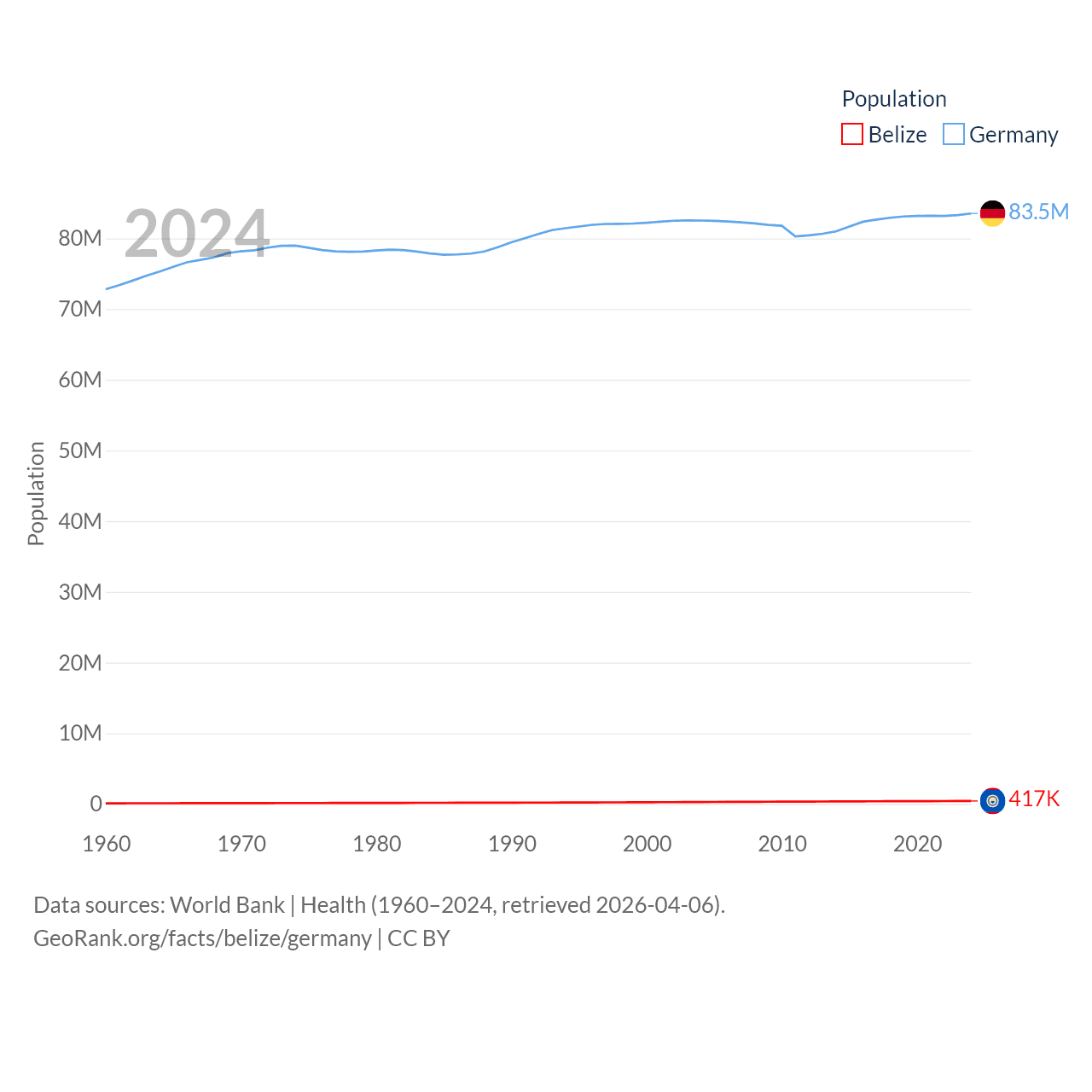 Belize has a population of 417K (ranked 171/197), compared with 83.5M in Germany (ranked 19/197). Belize's land area is 8,807 sq mi versus 134,916 sq mi for Germany (ranked 148th vs. 63rd).