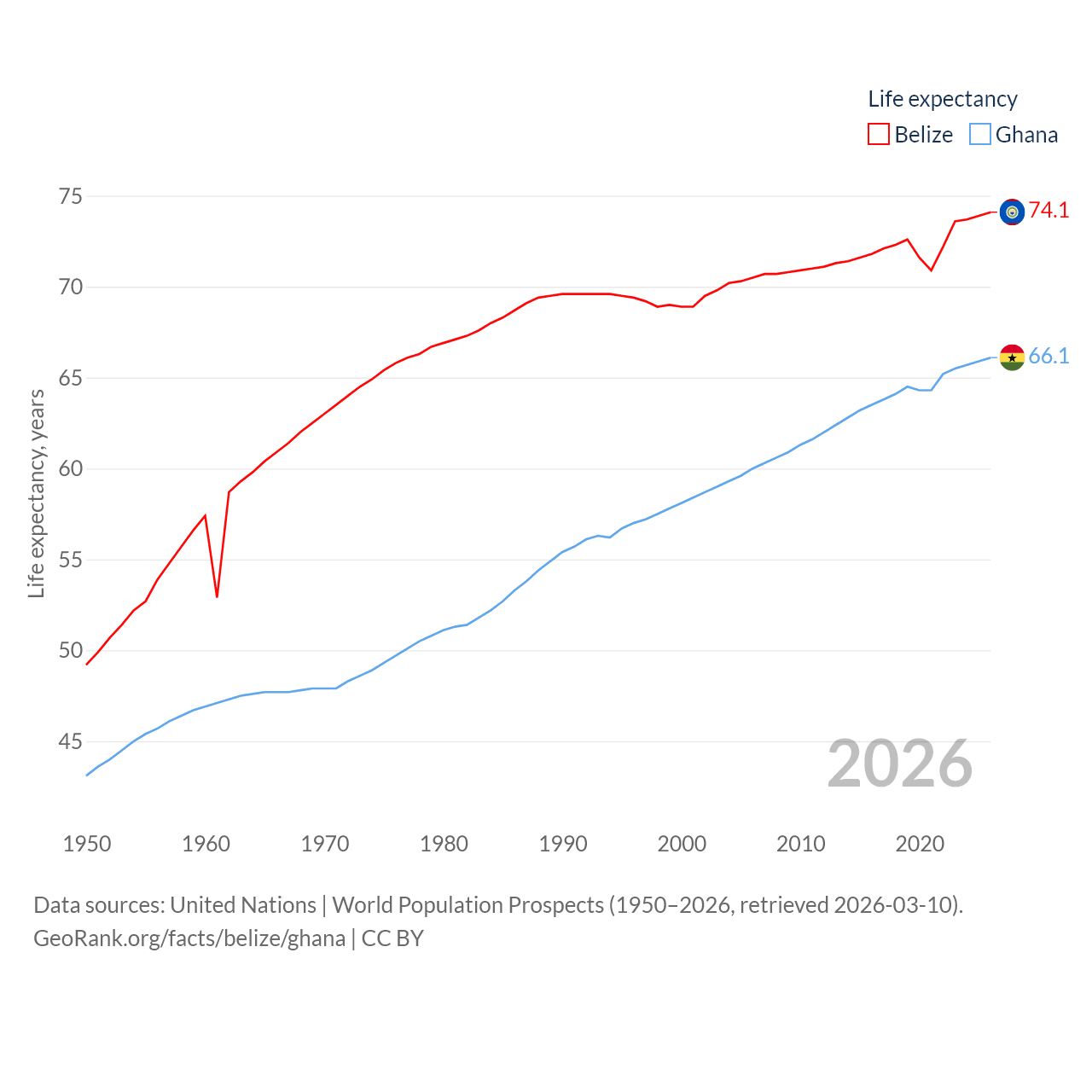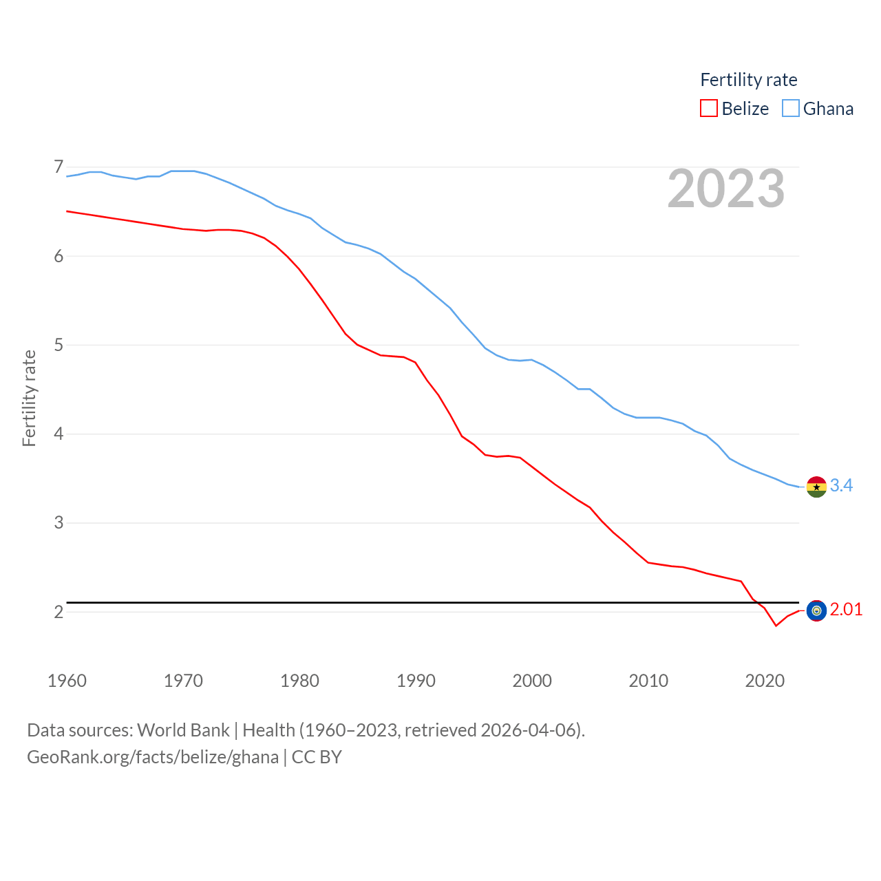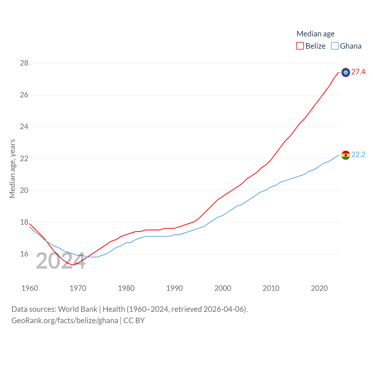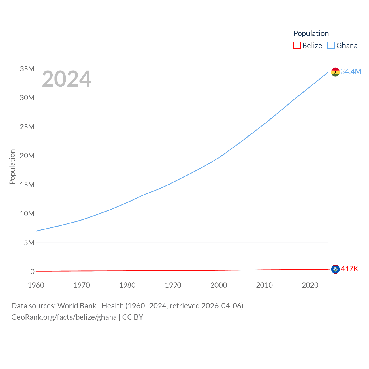 Belize has a population of 417K (ranked 171/197), compared with 34.4M in Ghana (ranked 47/197). Belize's land area is 8,807 sq mi versus 87,851 sq mi for Ghana (ranked 148th vs. 81st).