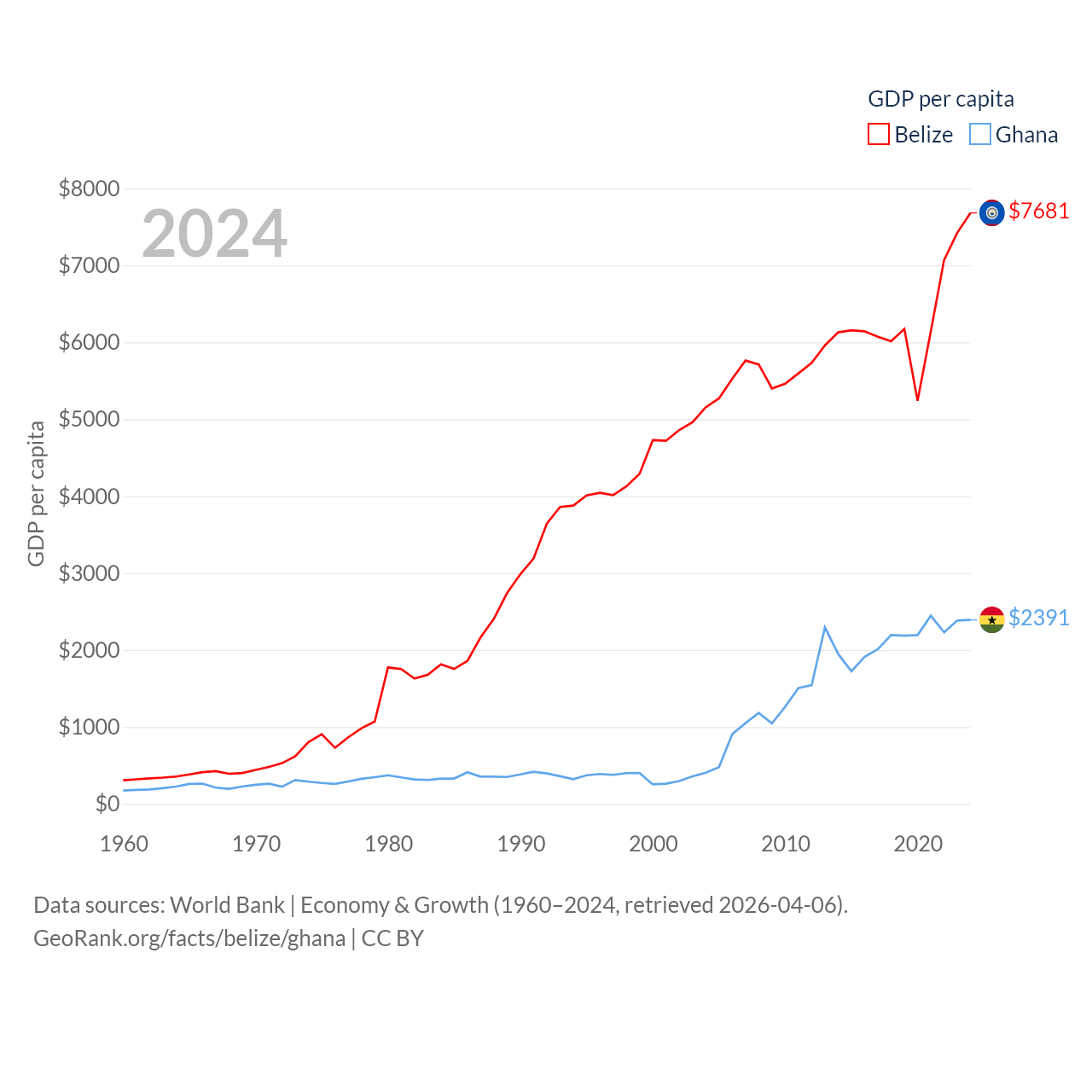 By GDP, Belize ranks 168/197 ($3.2B) and Ghana ranks 80/197 ($82.3B). By GDP per capita, Belize ranks 98/197 ($7,681), while Ghana ranks 151/197 ($2,391).
