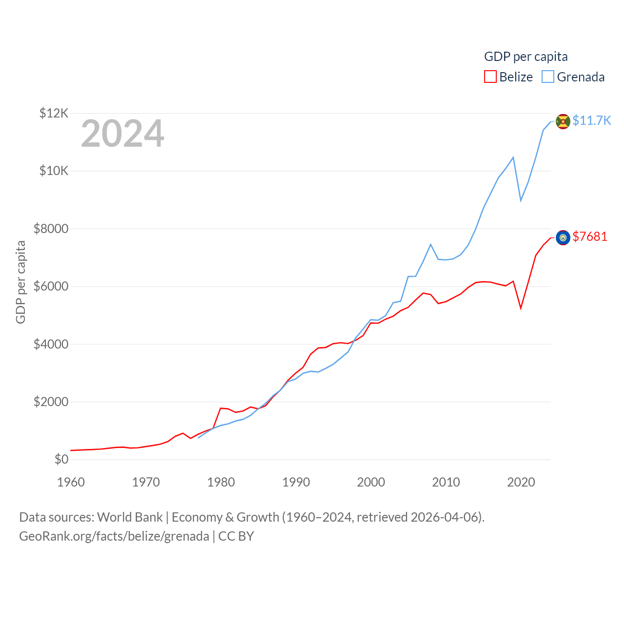 By GDP, Belize ranks 168/197 ($3.2B) and Grenada ranks 184/197 ($1.37B). By GDP per capita, Belize ranks 98/197 ($7,681), while Grenada ranks 80/197 ($11,705).