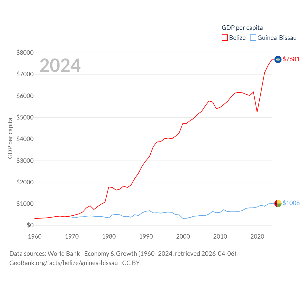 By GDP, Belize ranks 168/197 ($3.2B) and Guinea-Bissau ranks 176/197 ($2.22B). By GDP per capita, Belize ranks 98/197 ($7,681), while Guinea-Bissau ranks 177/197 ($1,008).