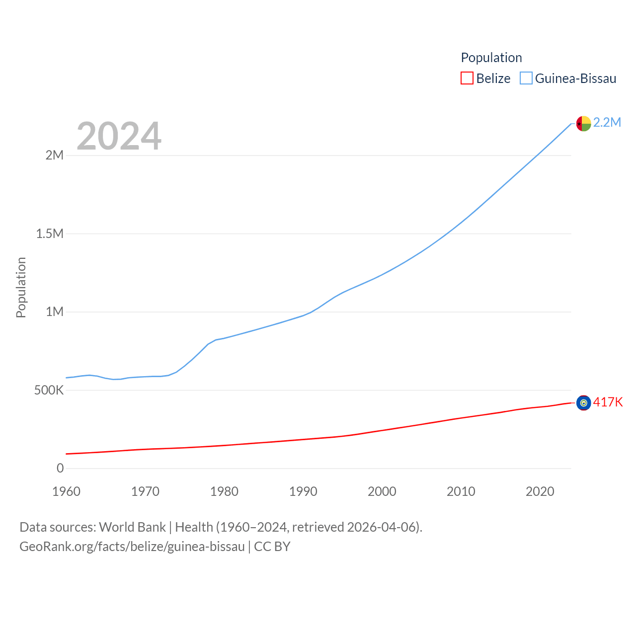 Belize has a population of 417K (ranked 171/197), compared with 2.2M in Guinea-Bissau (ranked 146/197). Belize's land area is 8,807 sq mi versus 10,857 sq mi for Guinea-Bissau (ranked 148th vs. 139th).